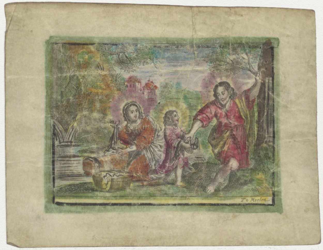 Maria, Joseph en Jesus (Jozef en Christus) in landschap, ingekleurd