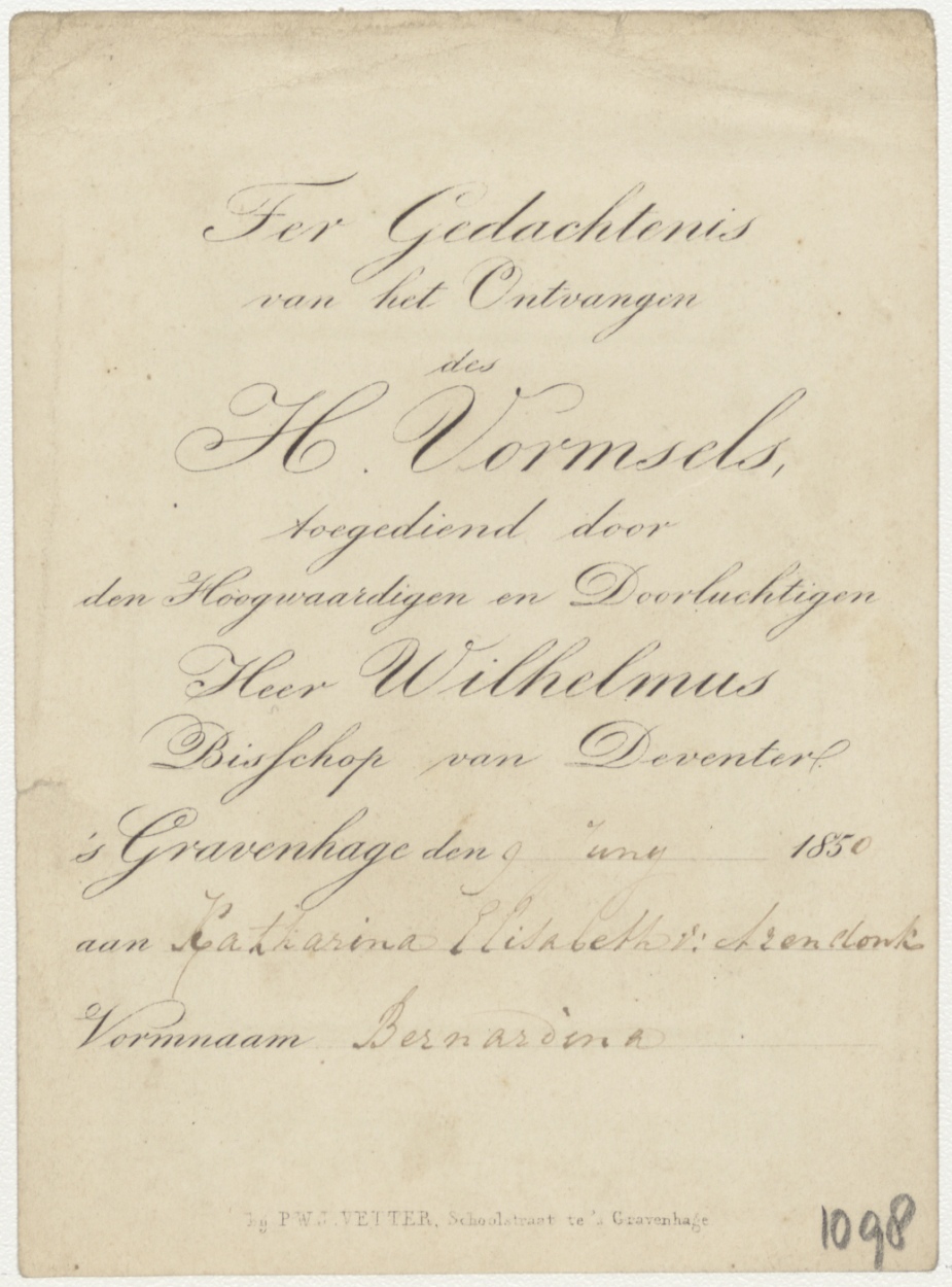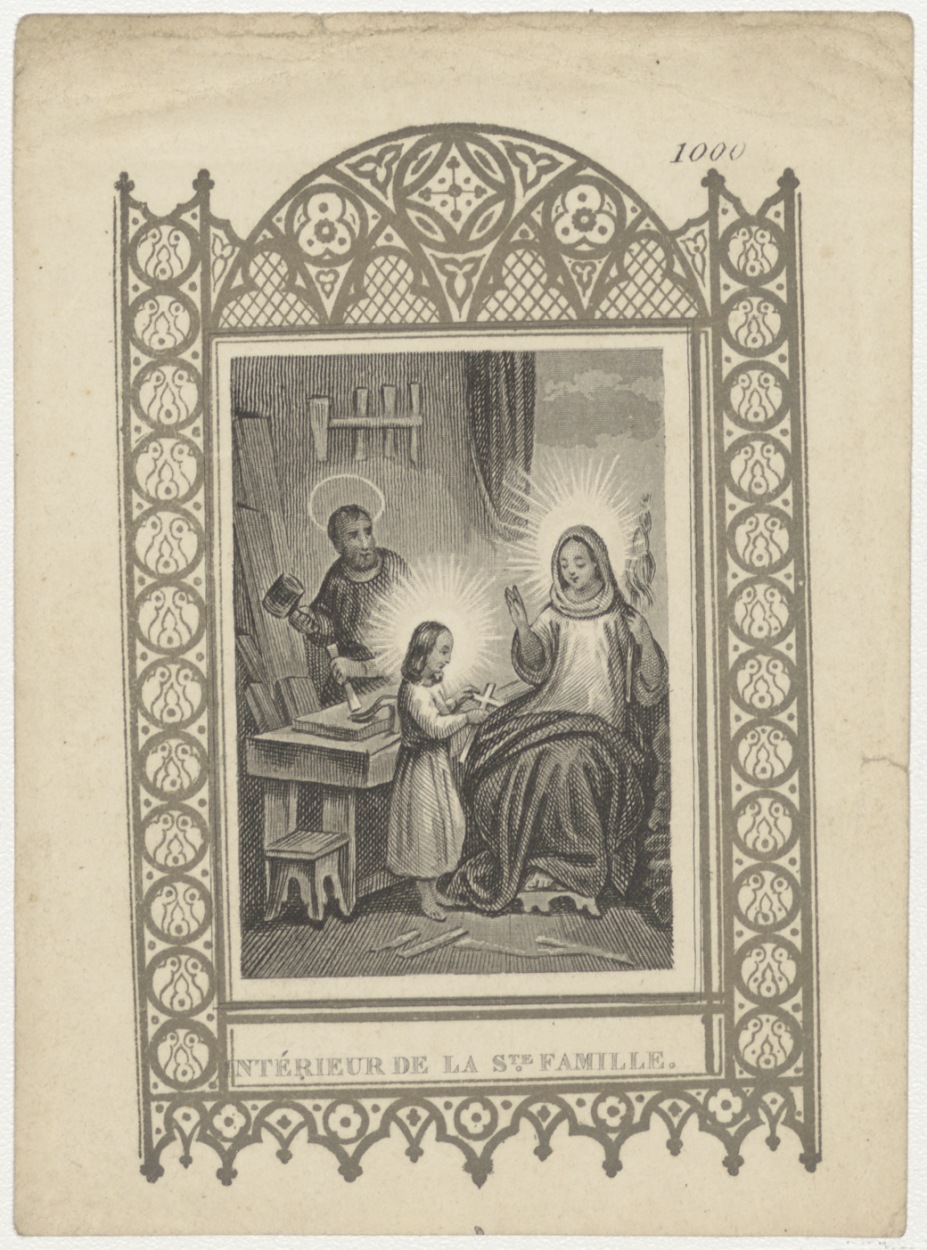 Timmermanswerkplaatsscène (Frans), kz. H. Vormsel Catharina Elisabeth Arendonk (1850) door Wilhelmus, bisschop van Deventer;Den Haag