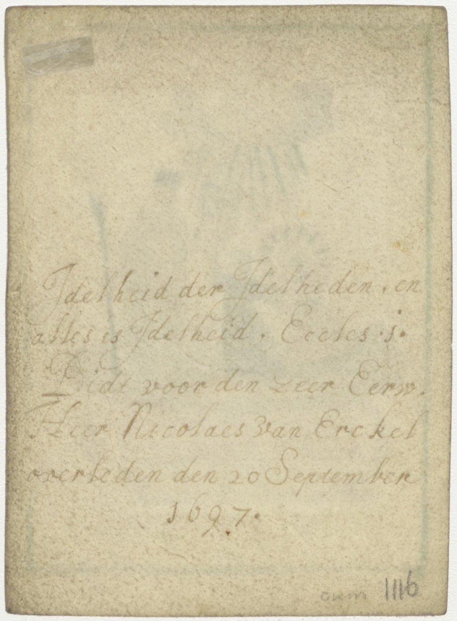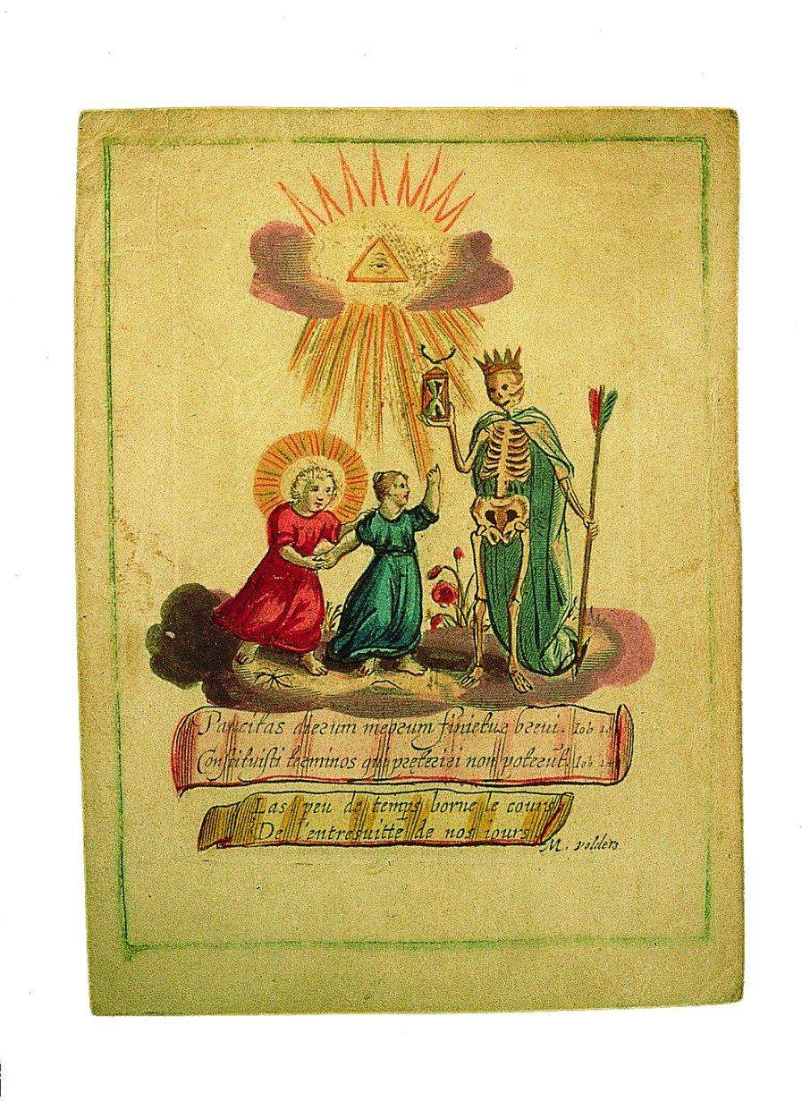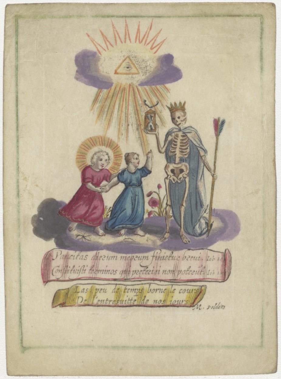 Skelet met twee kinderen en zandloper en het oog van Christus, kz. Religieus;Bid voor ziel Zeereerwaarde Heer Nicolaes van Erckel (+1697);