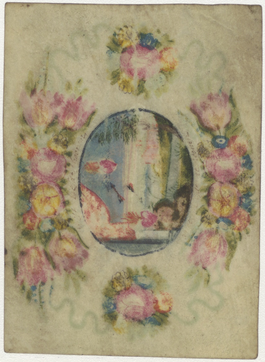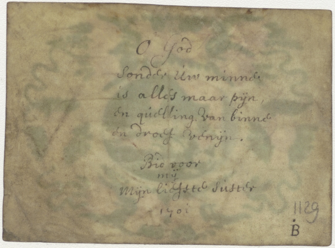 Twee vliegende brandende H. Harten(?) en twee pijlen in landschap, ingekleurd, kz. Gebed;Bid voor mijn liefste zuster;1701;