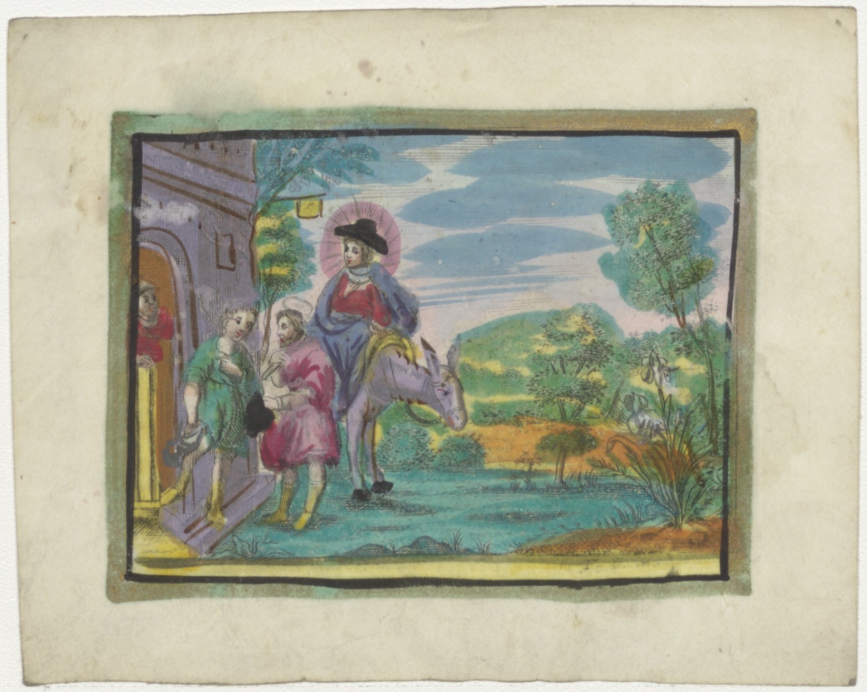 Jozef en Maria kloppen tevergeefs aan bij de herberg, ingekleurd