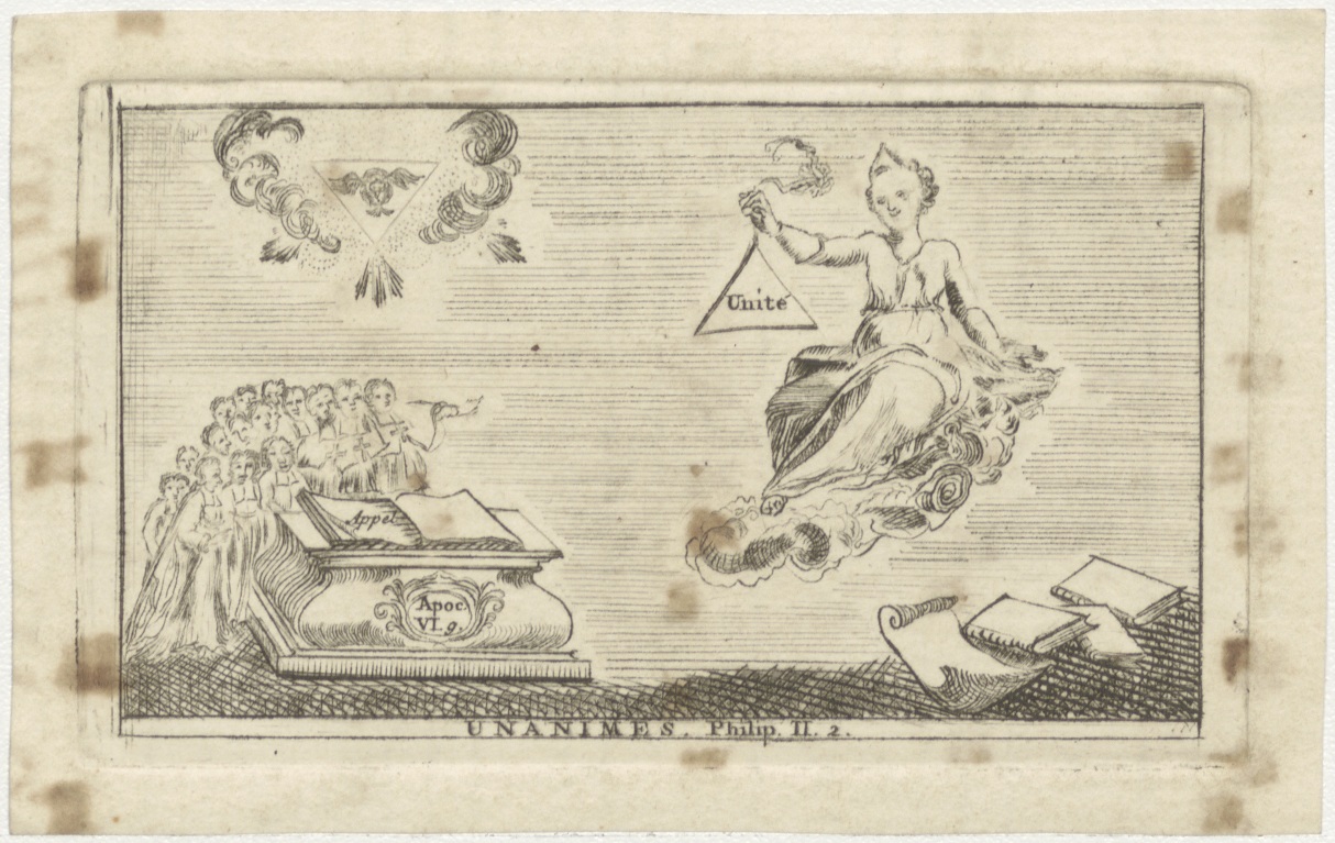 Christus op wolk met bord "unité", beneden mensen achter een altaar met appel