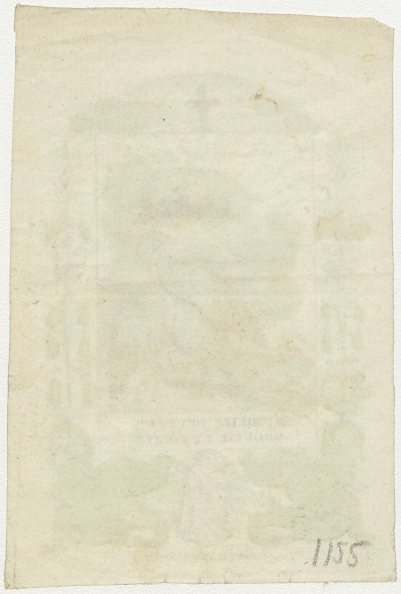 Nederigheid, zoetheid, trots, hooghartigheid (Frans), pauw met schaap en kruis, ingekleurd