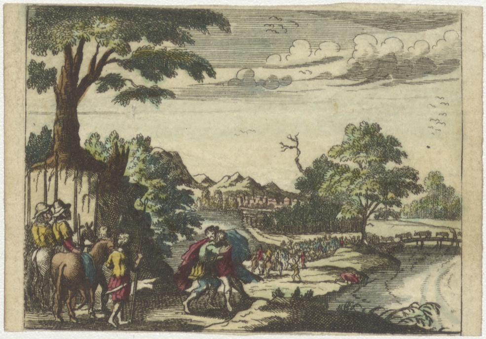 Omhelzing van twee mannen in landschap, ingekleurd