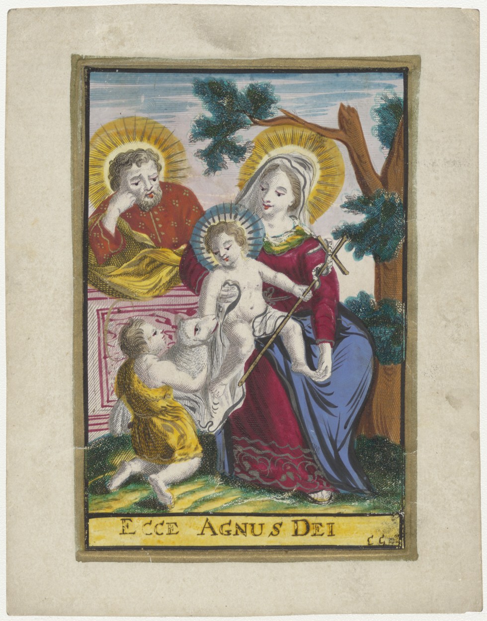 H. Familie, Jozef, Maria, Christuskind, Johannes, Ecce Agnus Dei, ingekleurd