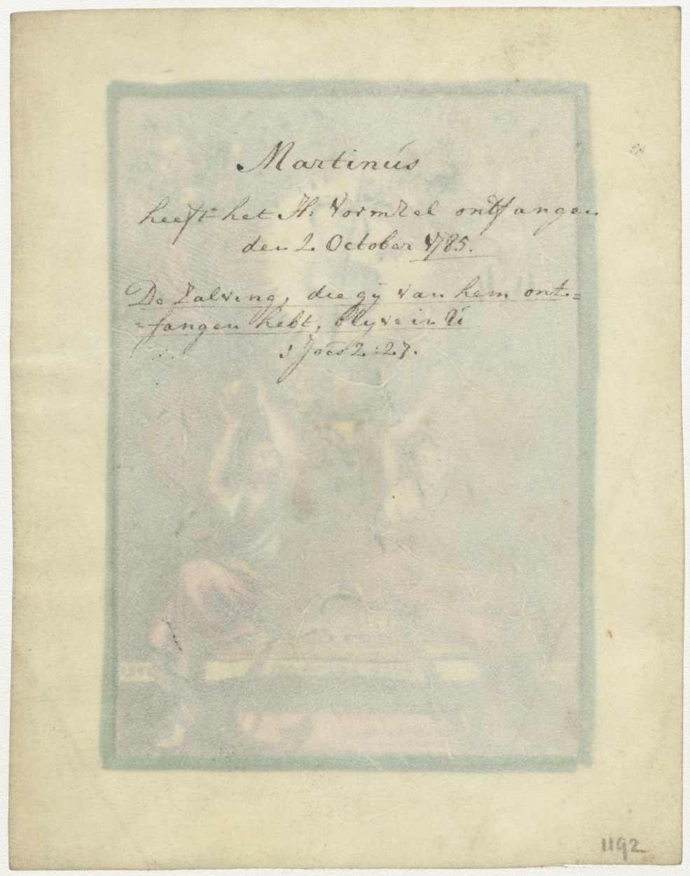 Ecce Agnus Dei, geloof, hoop en liefde, ingekleurd, kz. Vormsel Martinus (1785)