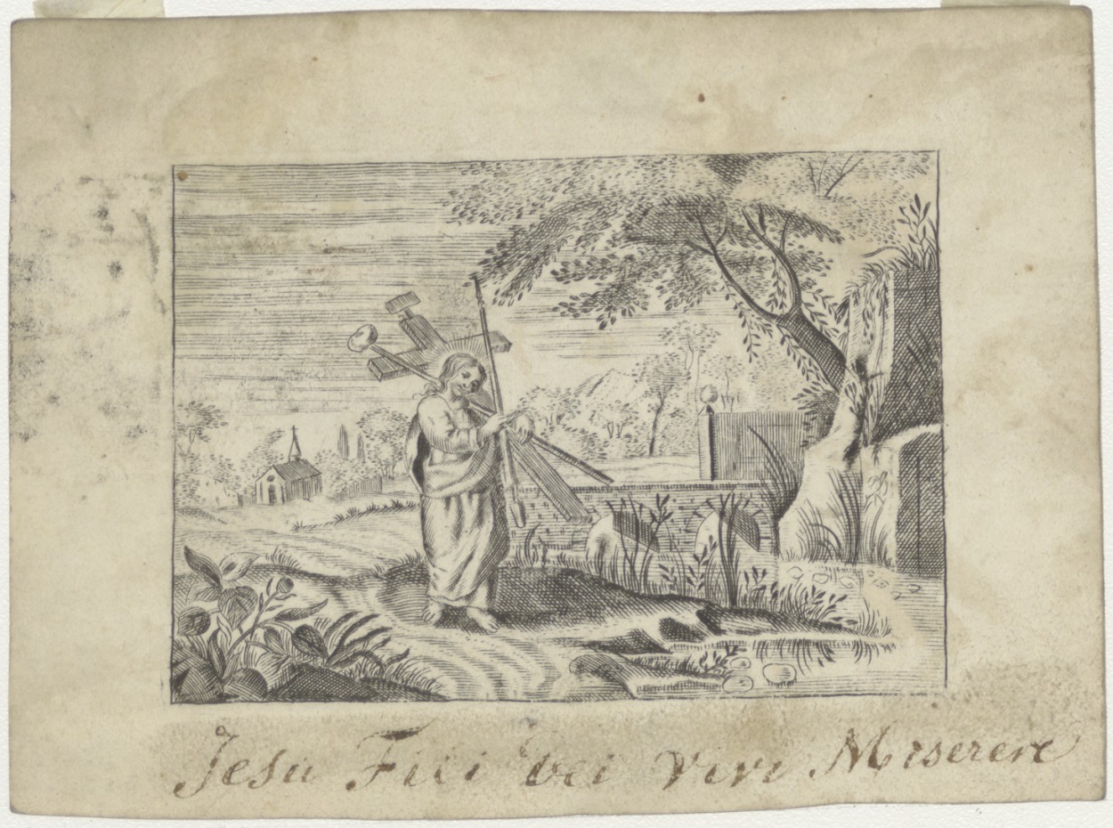 Christuskind draagt passiewerktuigen in landschap