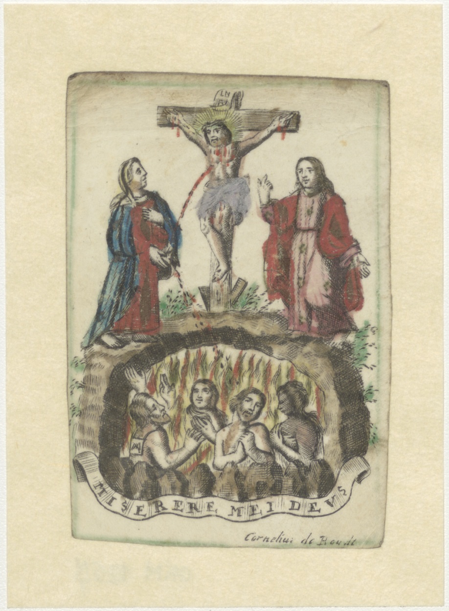 Christus aan het kruis, Maria en Johannes eronder, vagevuur, de hel, ingekleurd