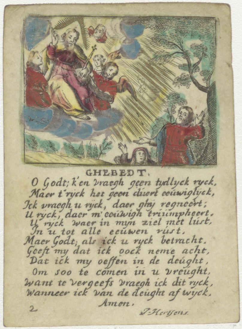 Christus vraagt God een eeuwig rijk, ingekleurd, met "Ghebedt O Godt; k' en vraegh geen tijdlijck rijck, Maar t'rijck het geen duert eeuwiglijck. ..."