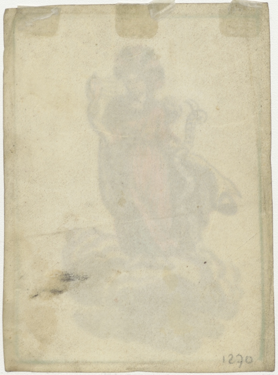Personificatie van de Liefde staand op wolk, met spiegel in de hand waarop kruis , met "amans anima statiat amantis", ingekleurd