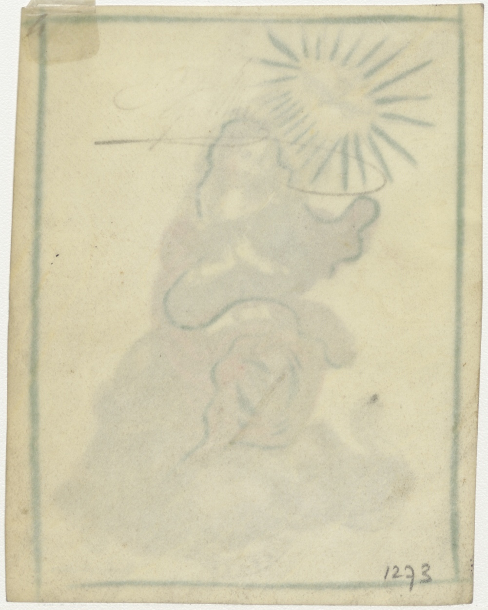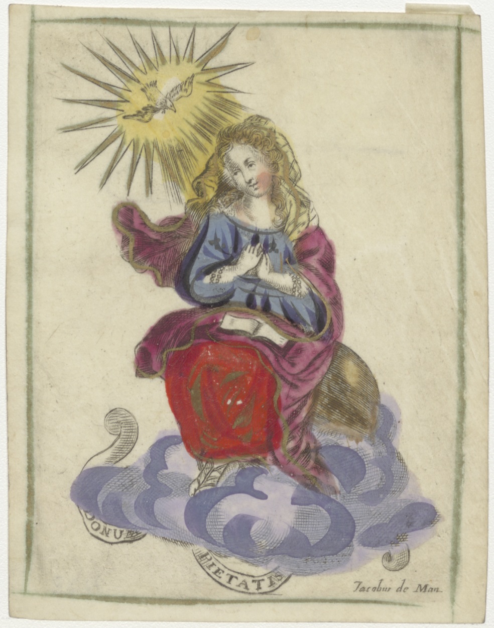 Personificatie van de Gave van Vroomheid zittend op wolk, waarboven H. Geest, met "Donum Pietatis", ingekleurd