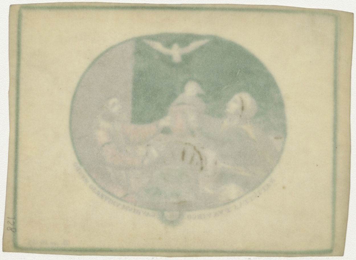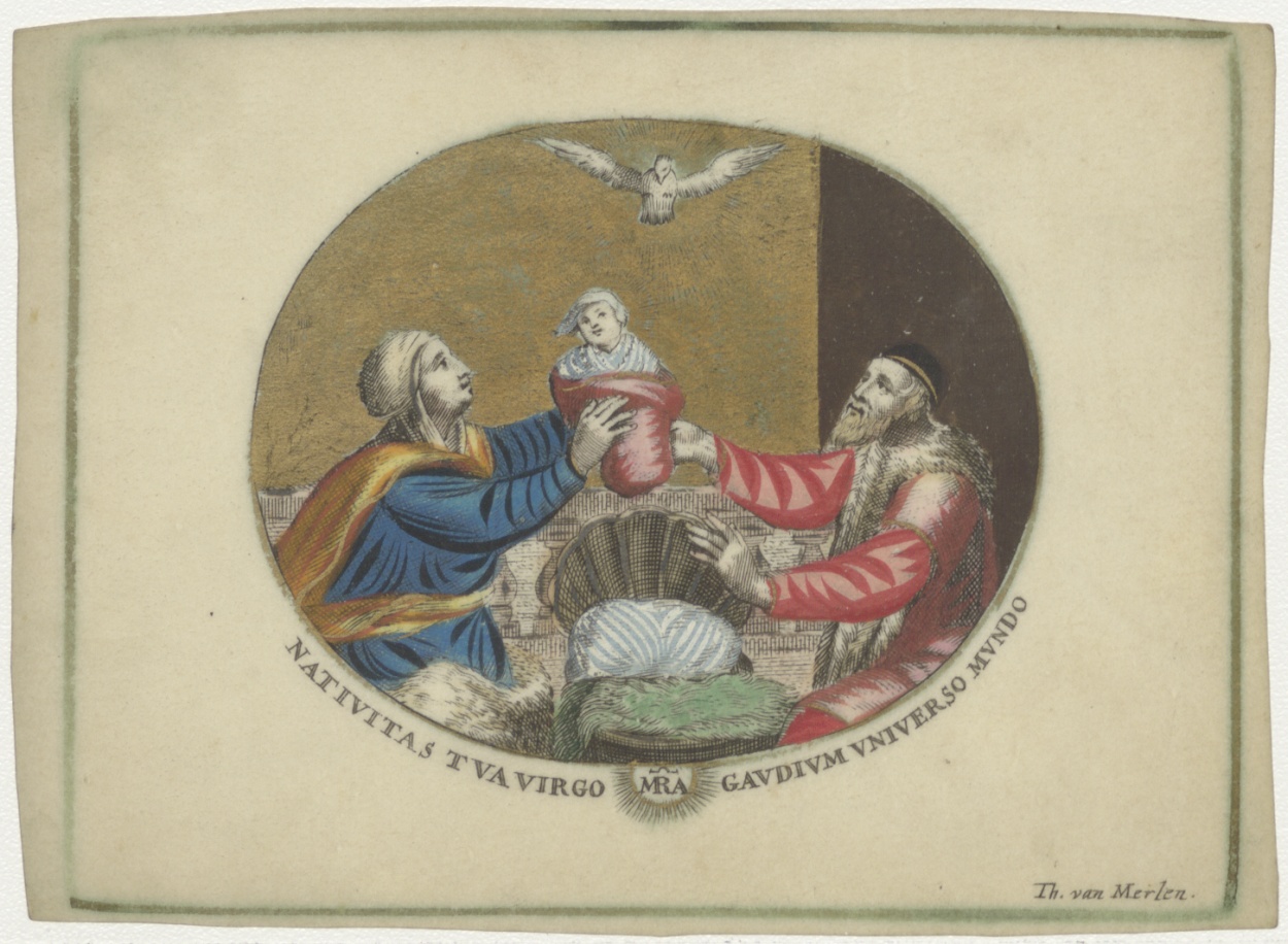 H. Familie met duif, geboorte van Christus Nativitas tua virgo Maria gaudium universo mundo, ingekleurd