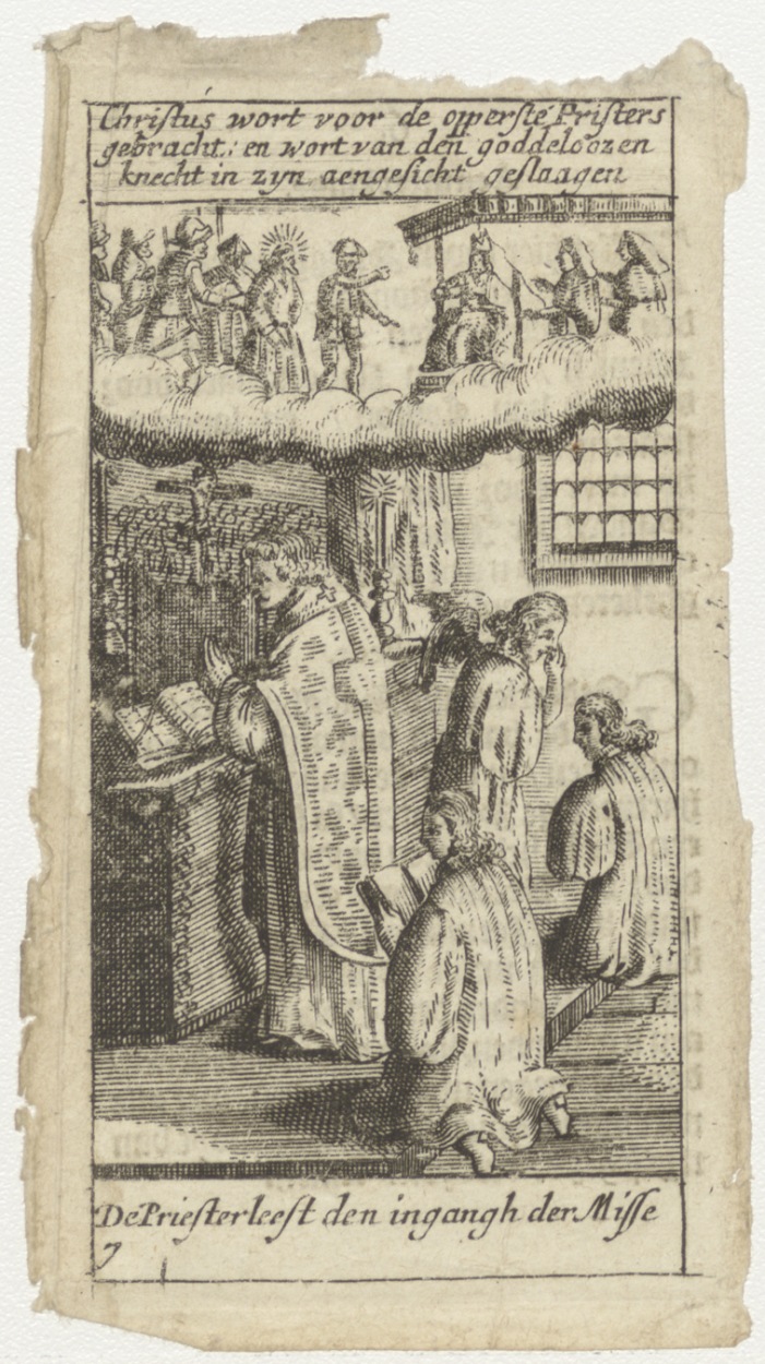 Altaarscène, Christus wordt voor de opperste priester gebracht (passiescene), kz. drukwerk;tekst;