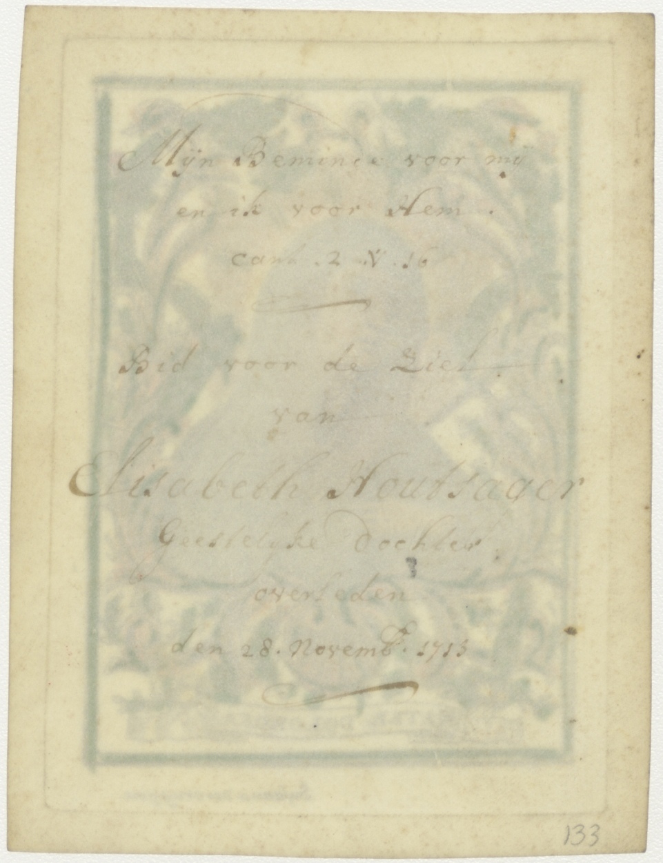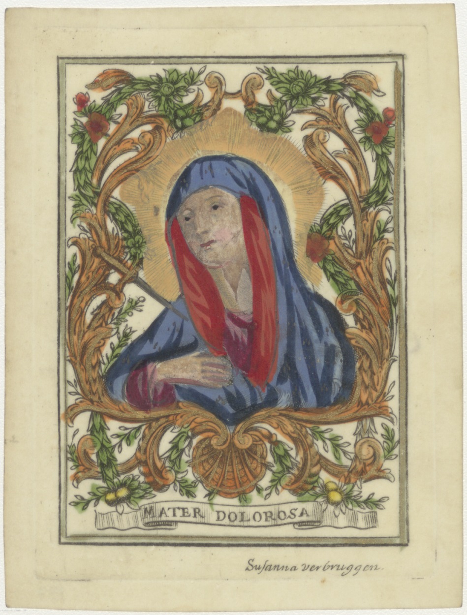 Maria, Mater Dolorosa, ingekleurd, kz. Religieus;Bid voor ziel Houtsager (+1713)geestelijk dochter;