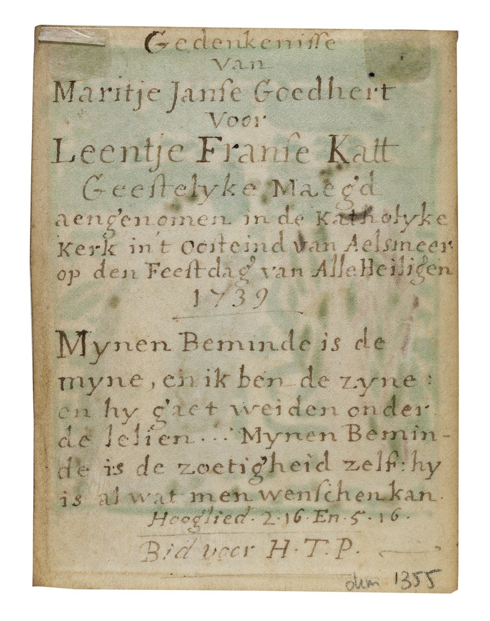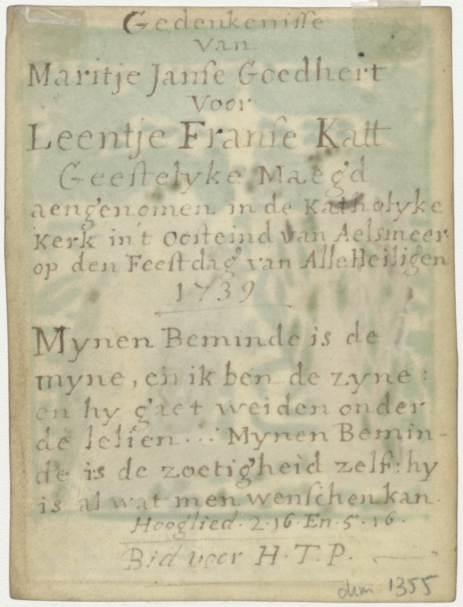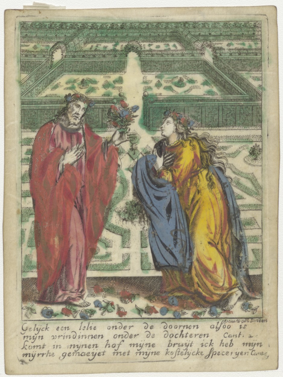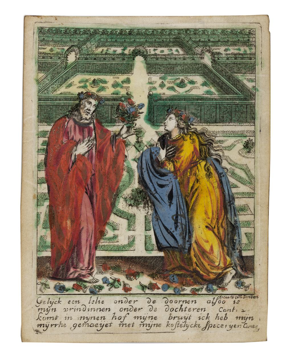Christus geeft lelies aan een vrouw, op de achtergrond tuinen, ingekleurd, kz. Religieus;gedenkenisse van Maritje Janse Goedhert voor Leentje Franse Katt, geestelijk maegd aangenomen in katholieke kerk 1739, Bid voor H.T.P.