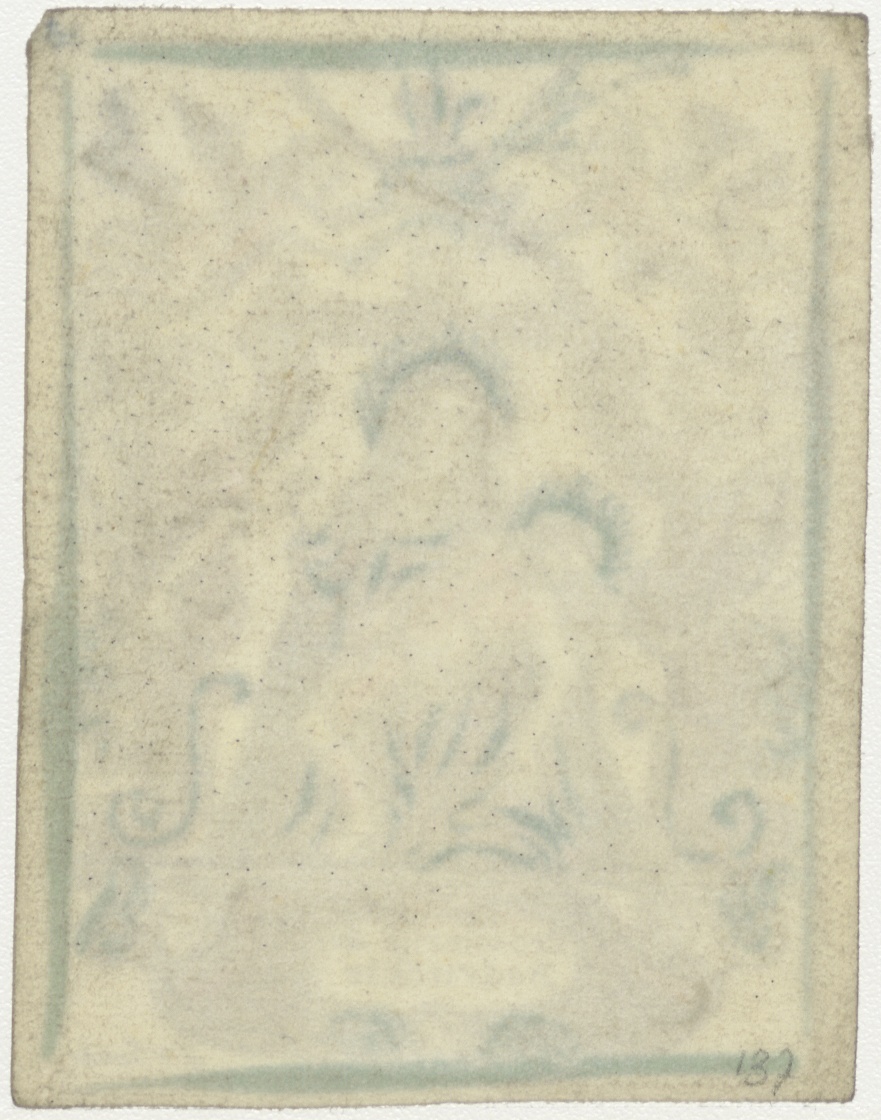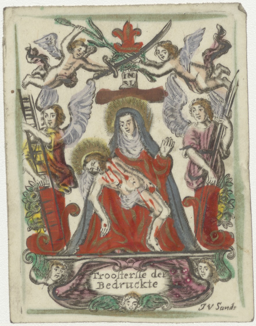 Maria, troosteres van de bedroefden (bedruckte), piëta, ingekleurd, kz. tekst;