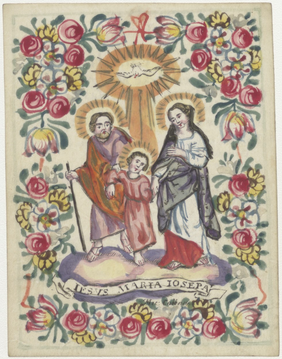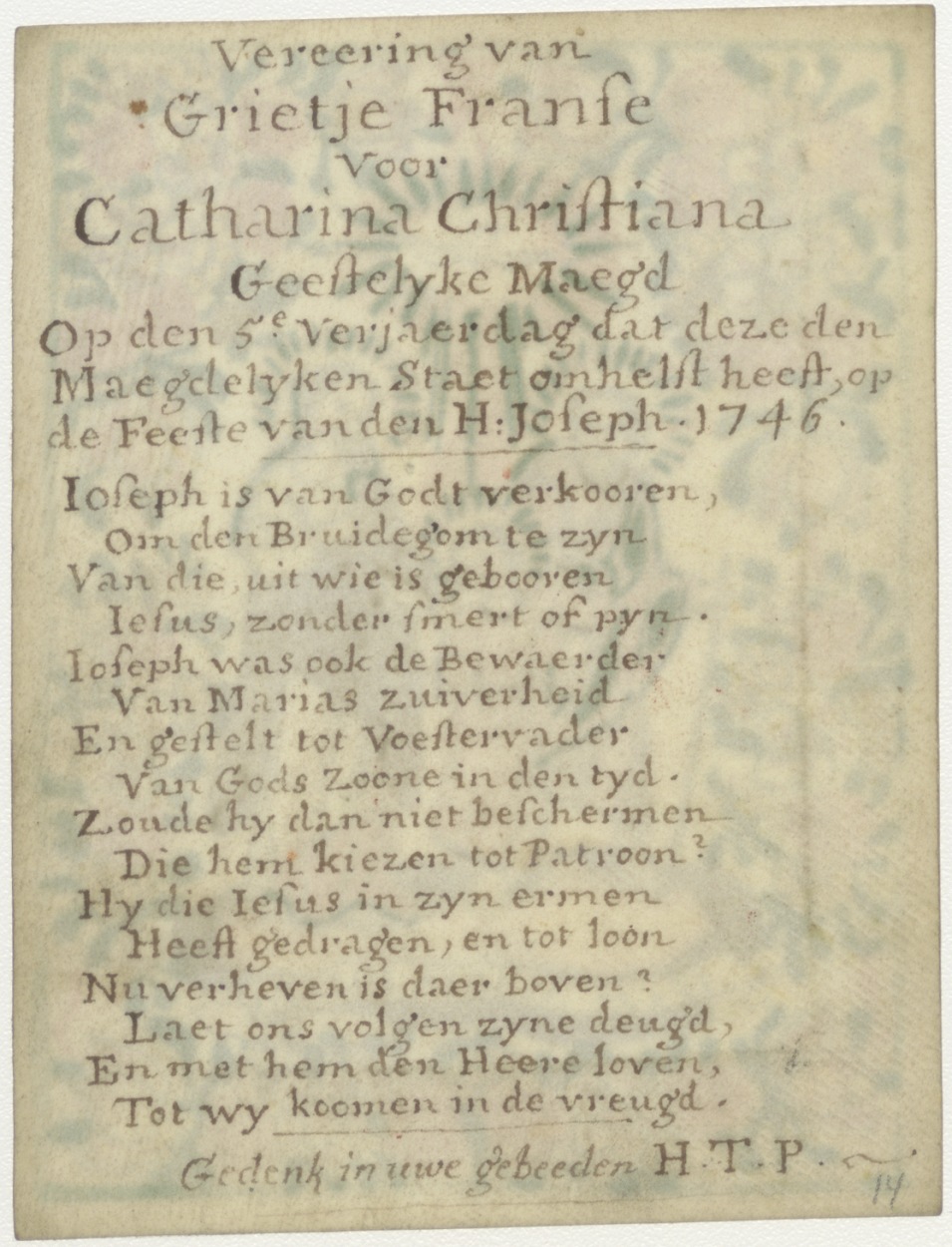 H. Familie, ingekleurd, kz. Religieus; Grietje Franse voor Catharina Christiana t.g.v. vijfjarig jubileum geestelijk maagd,1746, met gebed en gedenk in uwe gebeeden H.T.P.