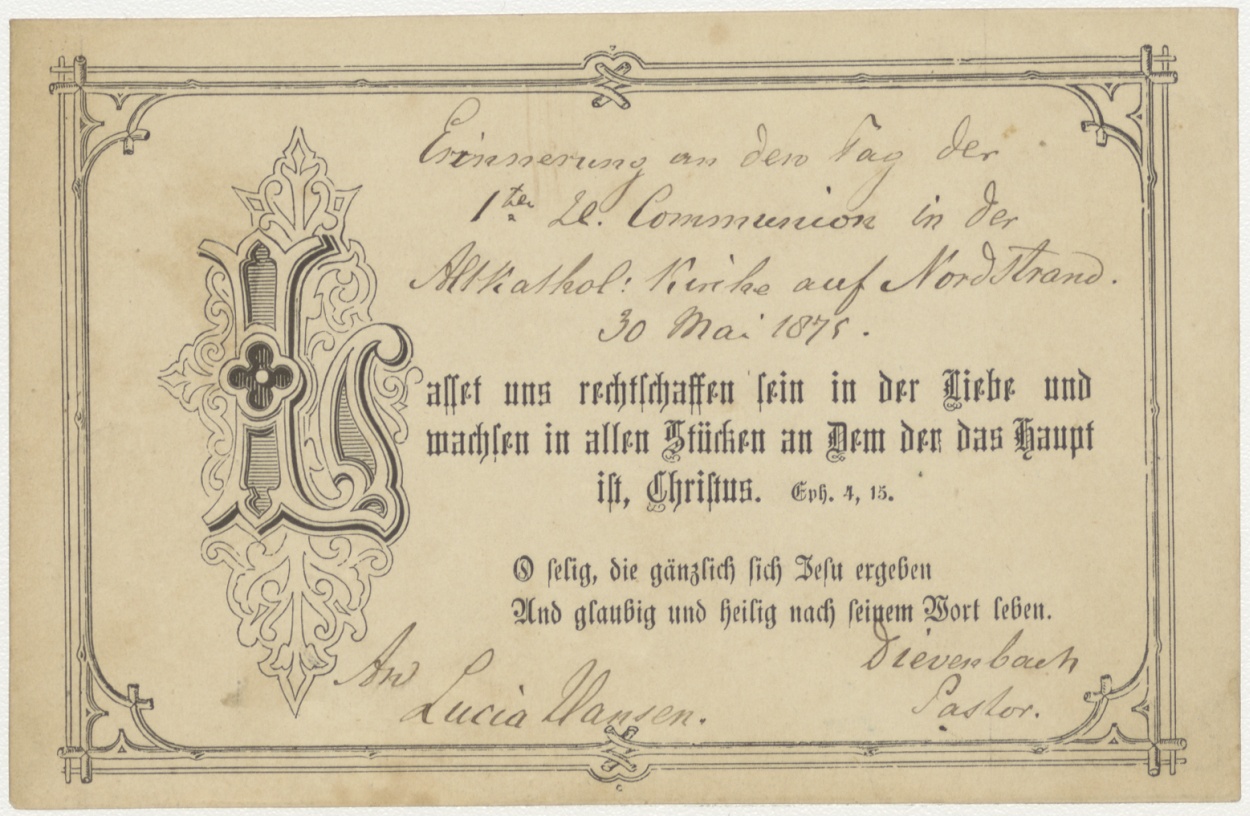 Spreuk (Duits), kz. H. Communie Hansen; 1875; door pastoor Dierenbach (Duits)