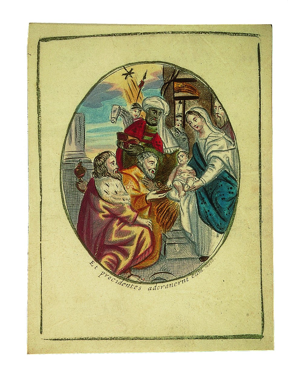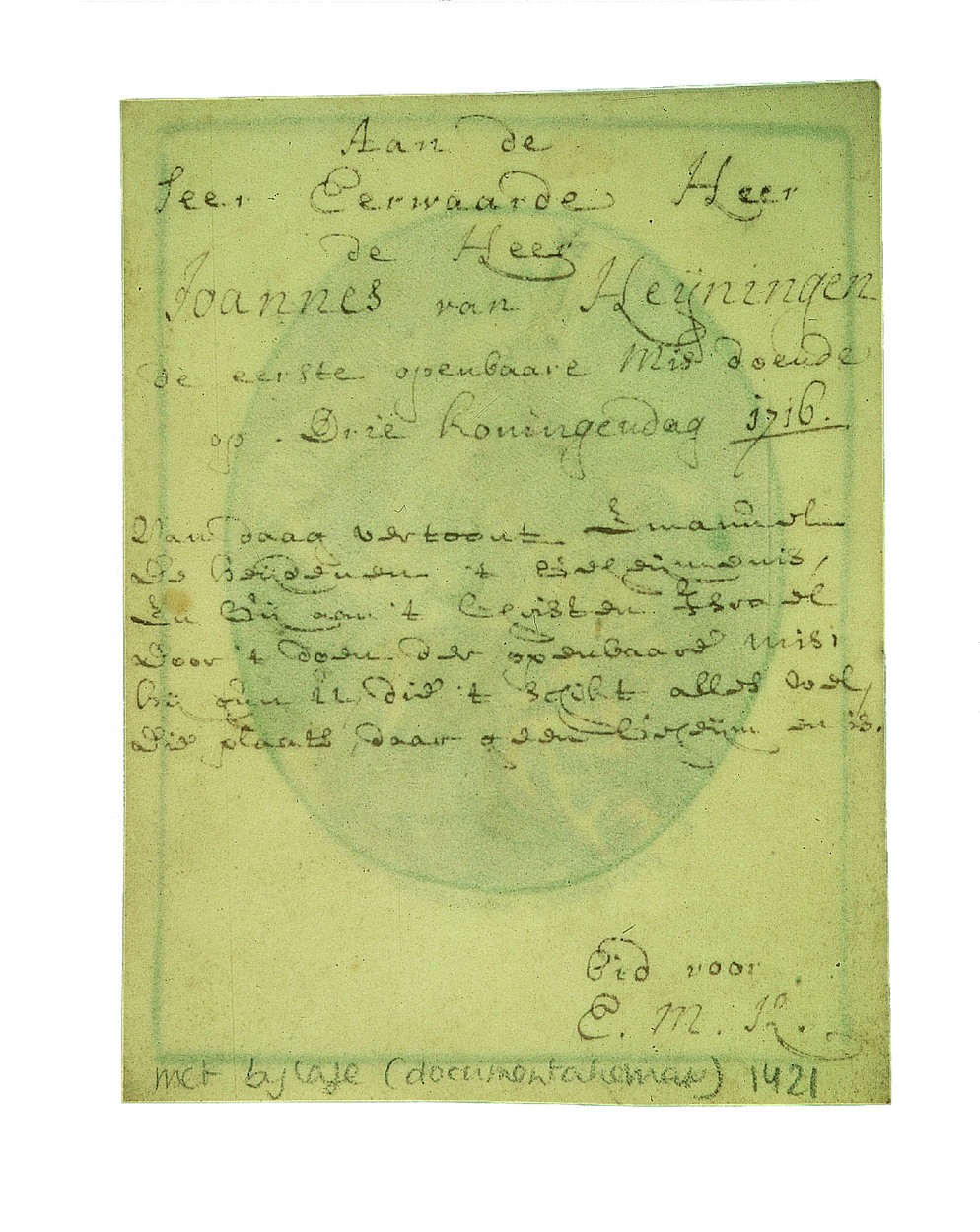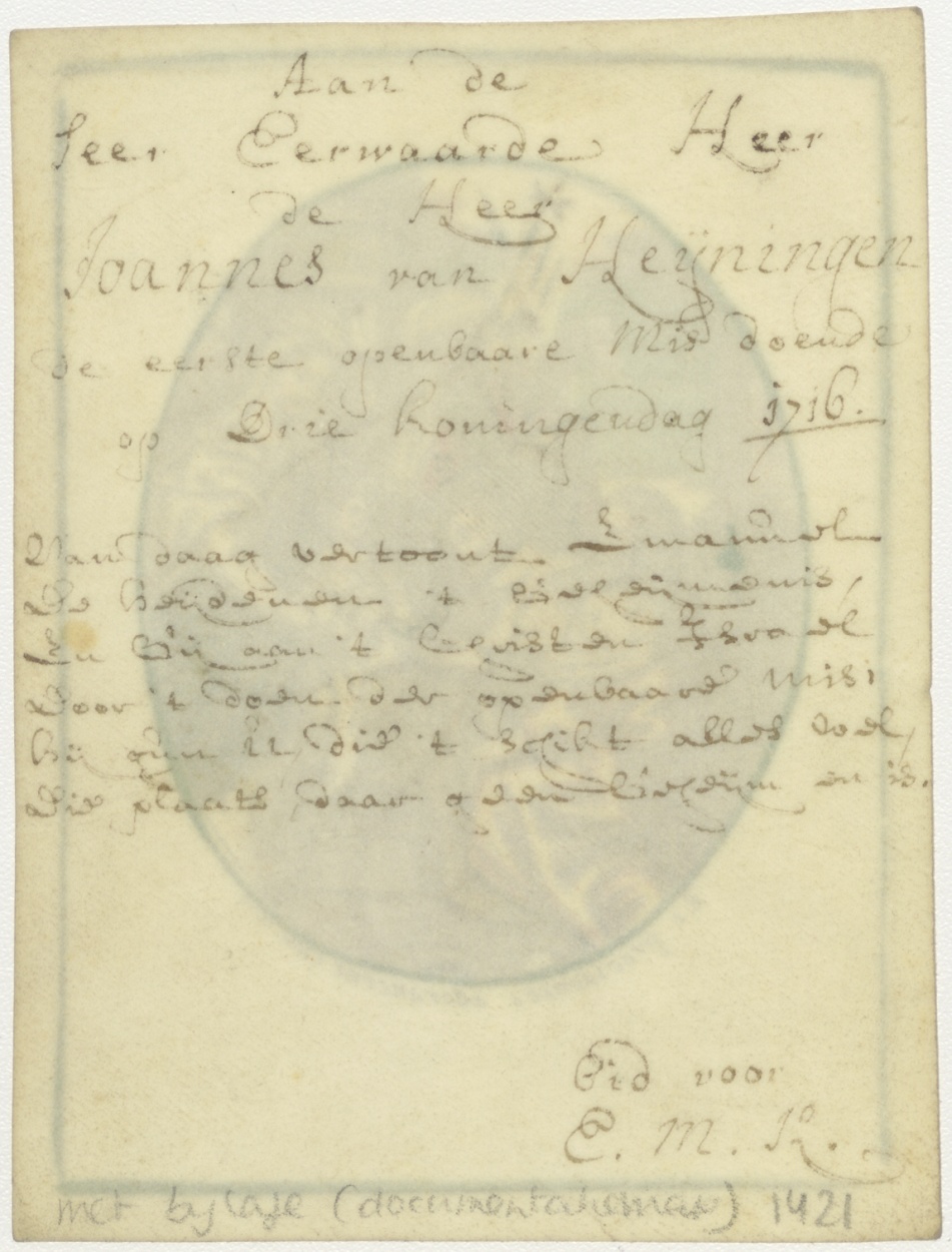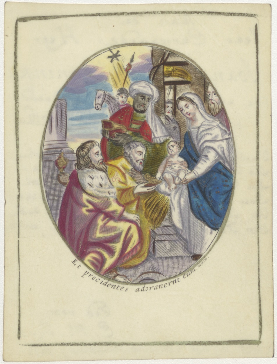Aanbidding der koningen, ingekleurd, kz. Aan de seer eerwaarde heer Joannes van Heijningen de eerste openbare Mis doende op Drie Koningendag 1716
