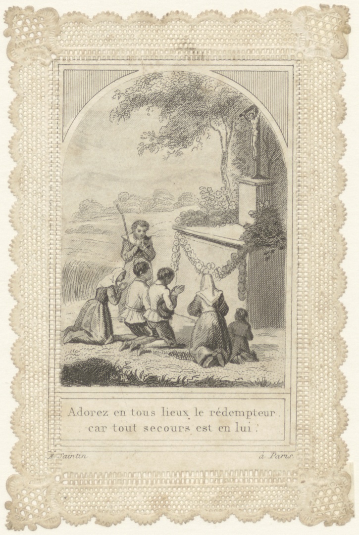Mensen in gebed bij wegkruis, kz. gebed (Frans)