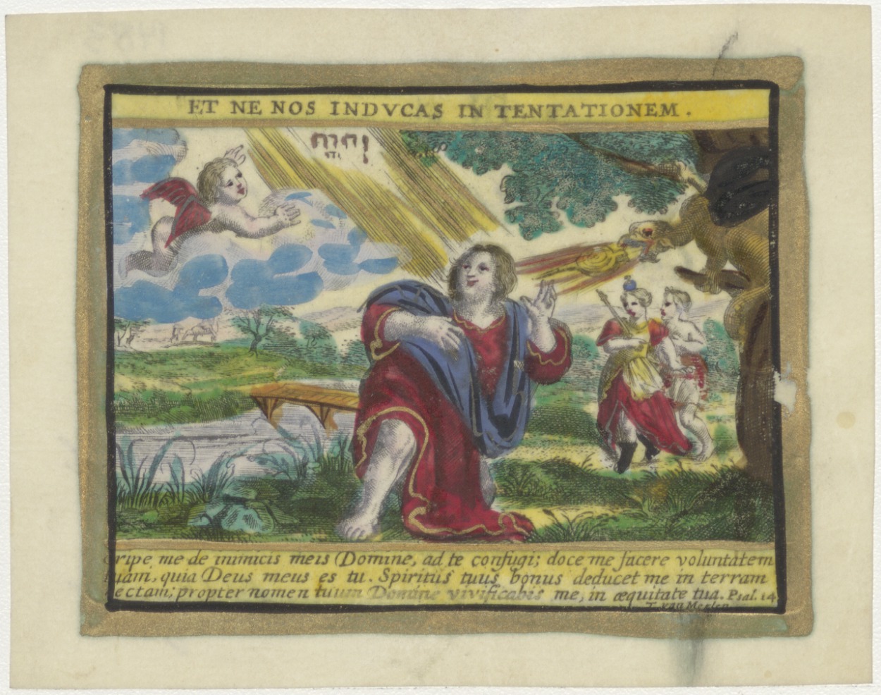 En lydt ons niet in bekoring; man naast duivel richt zich tot God., ingekleurd, kz. droogh bid voor Adr. Aug Mooleman, priester