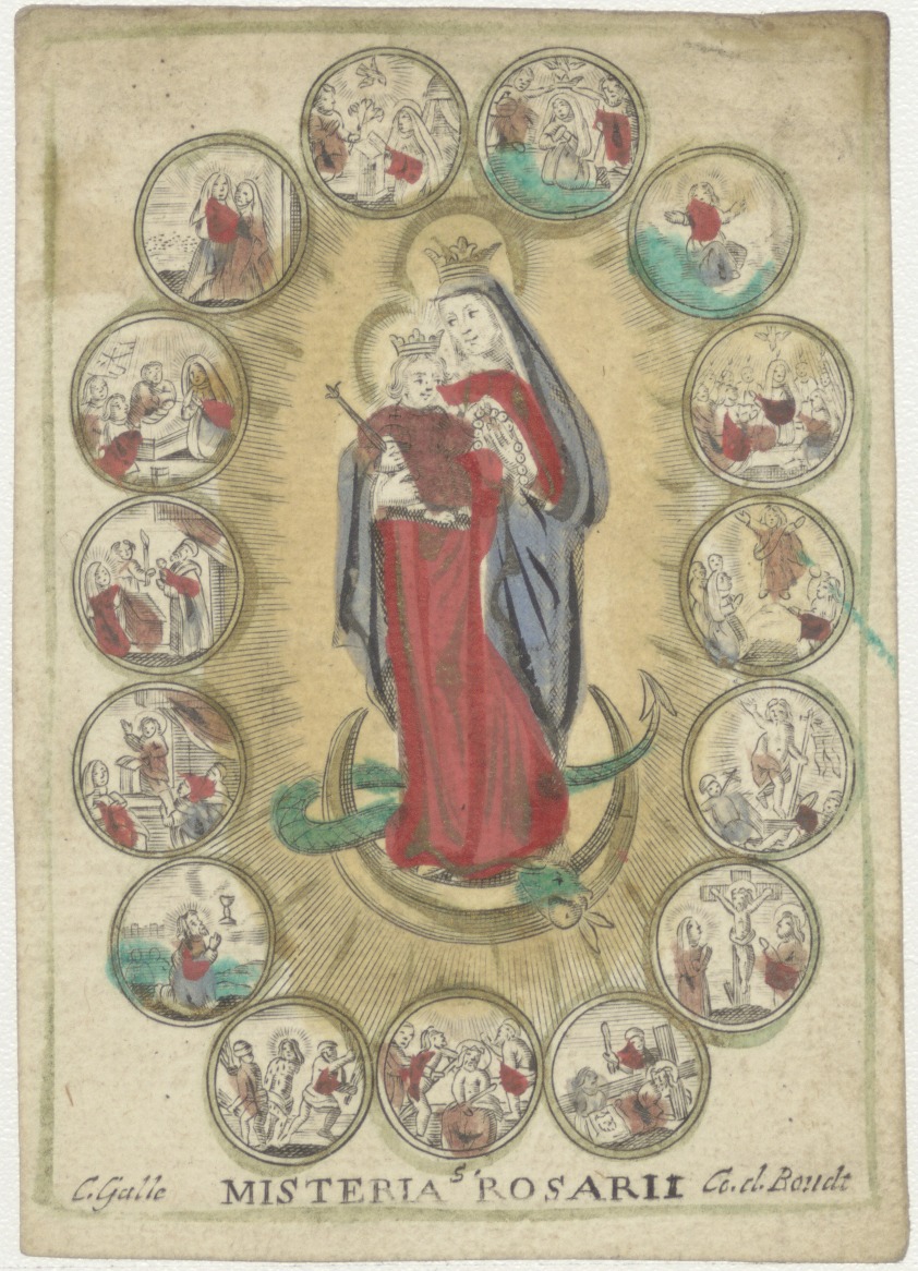 Maria, mysteria rosarii, O.L.V. van de rozenkrans, omringd door scènes leven Christus, ingekleurd