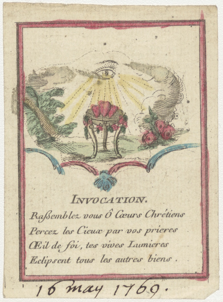 Invocation...;oog schijnt op tafel met harten (Frans), ingekleurd, kz. 1769