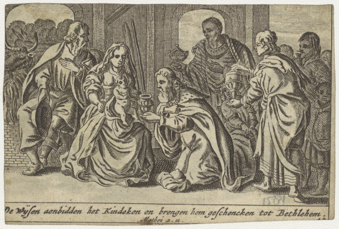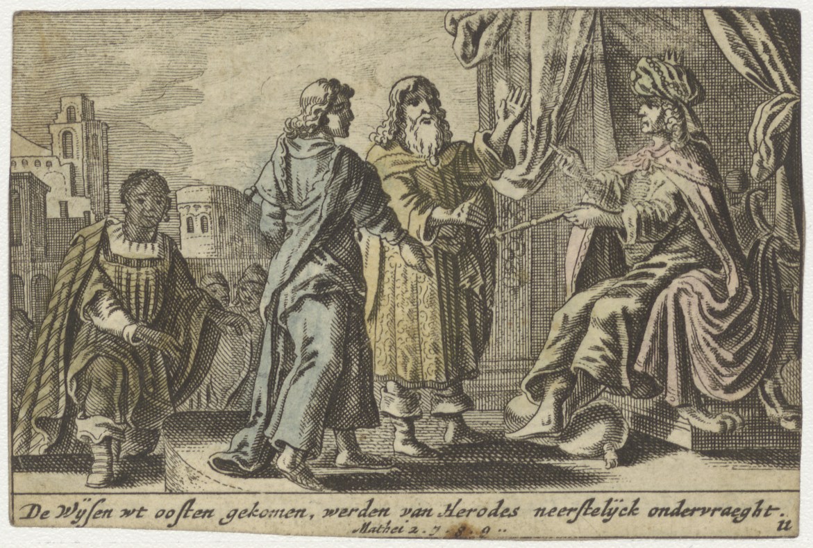 Wijzen uit het oosten bij Herodus; aanbidding van de koningen, ingekleurd, kz. zie titel, dubbelzijdig