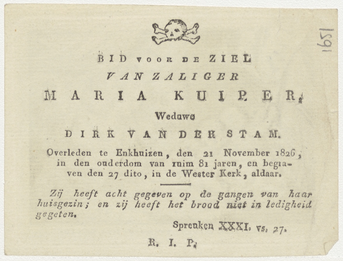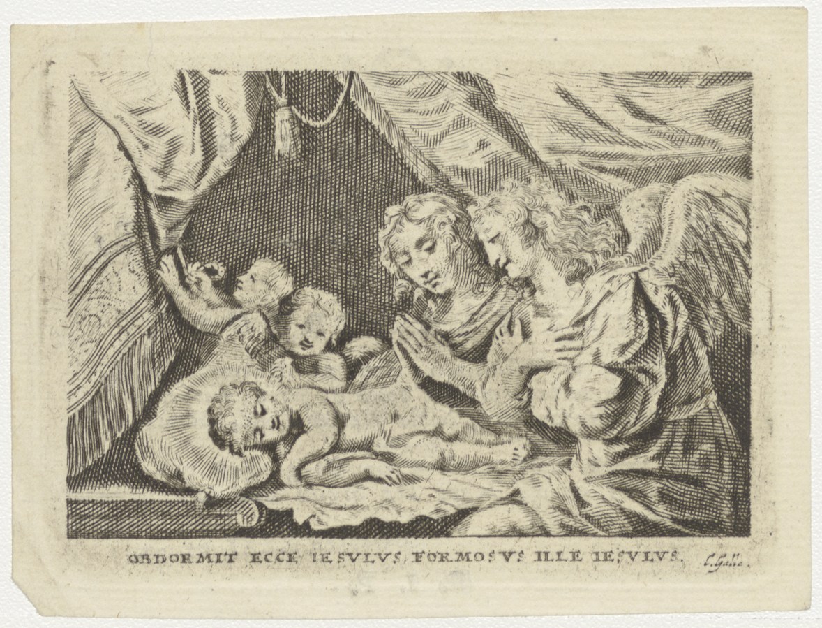 Christuskind aanbeden door engelen en heiligen, kz. bid voor ziel Kuiper-van der Stam (+1826) Enkhuizen