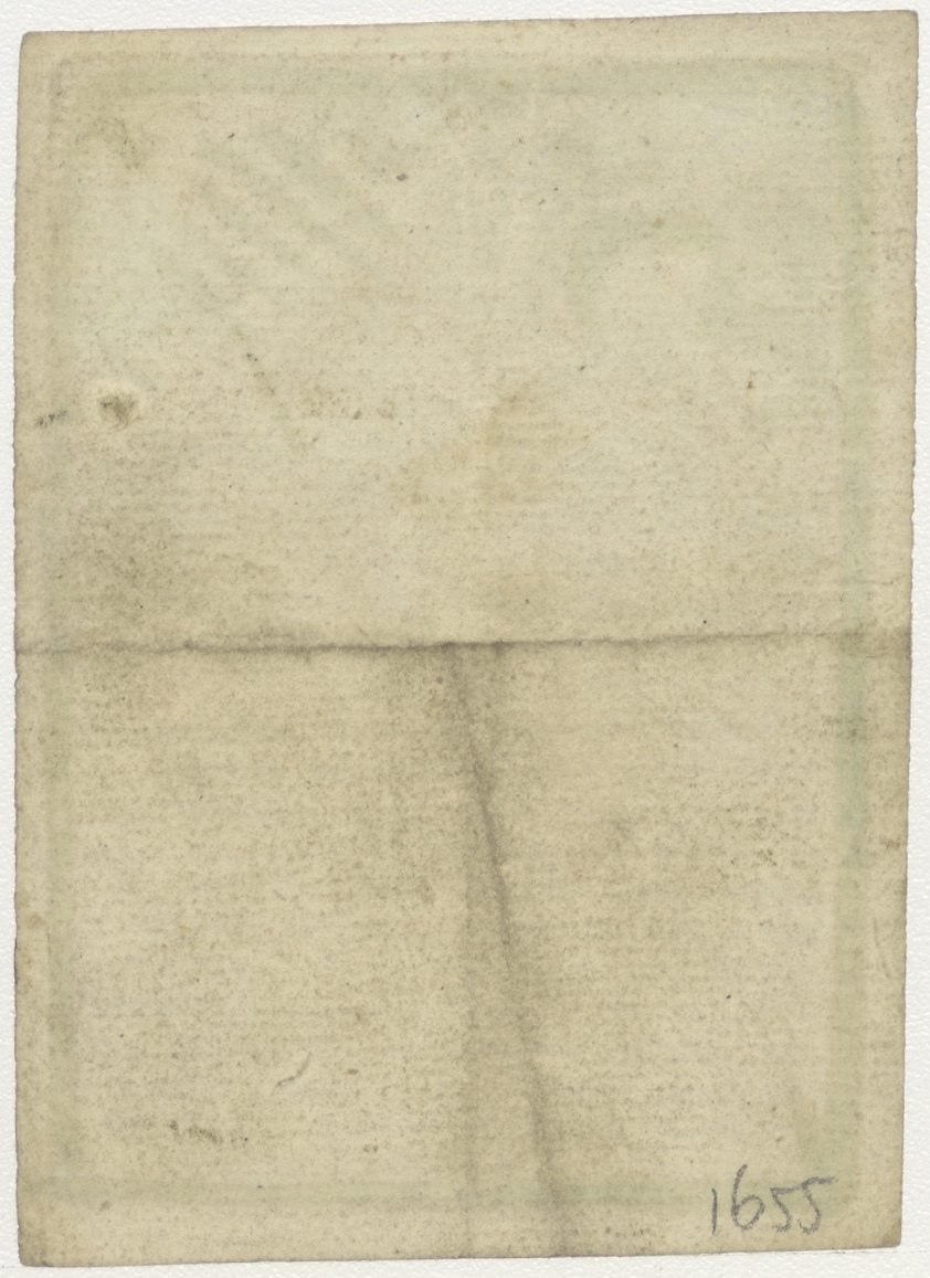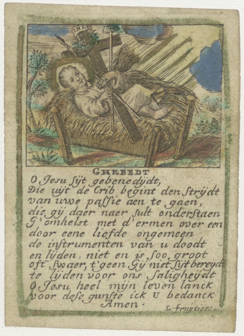 Christuskind met martelwerktuigen in weide met gebed, ingekleurd
