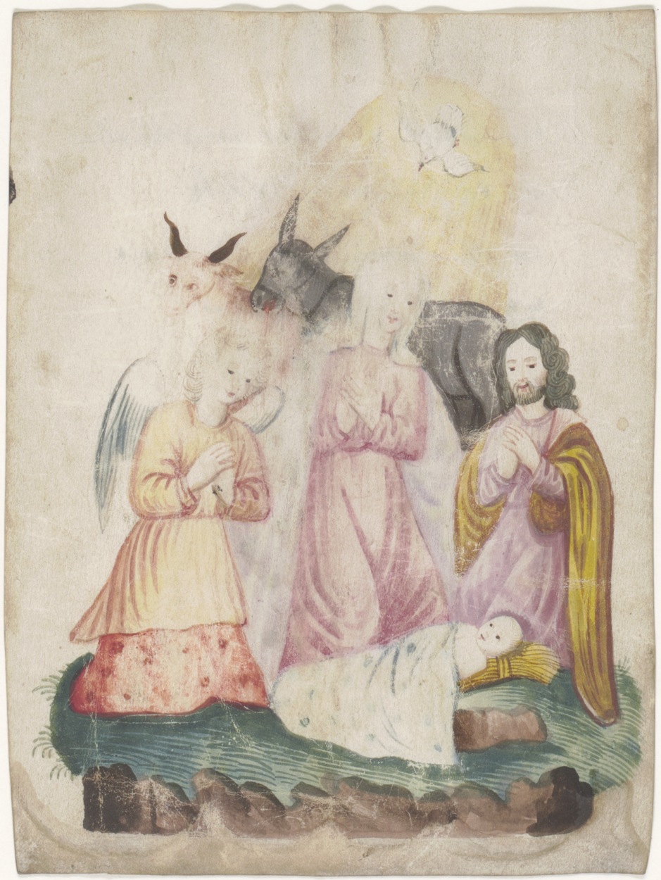Geboorte van Christus, ingekleurd, kz. bid voor ziel Basser (+1844)