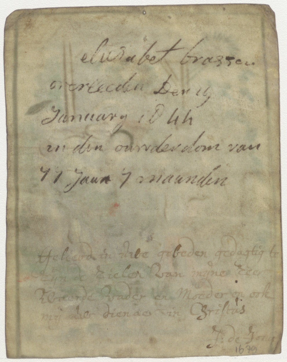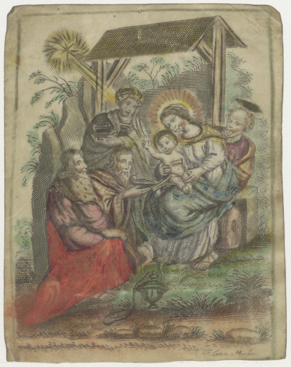 Aanbidding der koningen, ingekleurd, kz. dubbel gebruik; bid voor ziel Brasser (+1844);bid voor pastoor J.de Jong