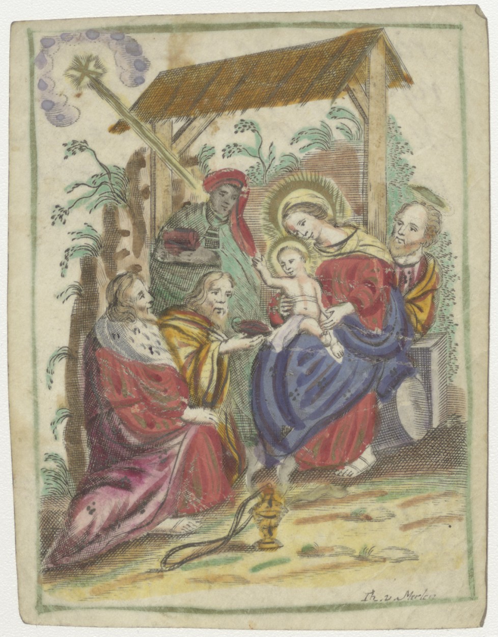 Aanbidding der koningen, ingekleurd, kz. Geschenk van Zalk aan Valk voor verjaardag
