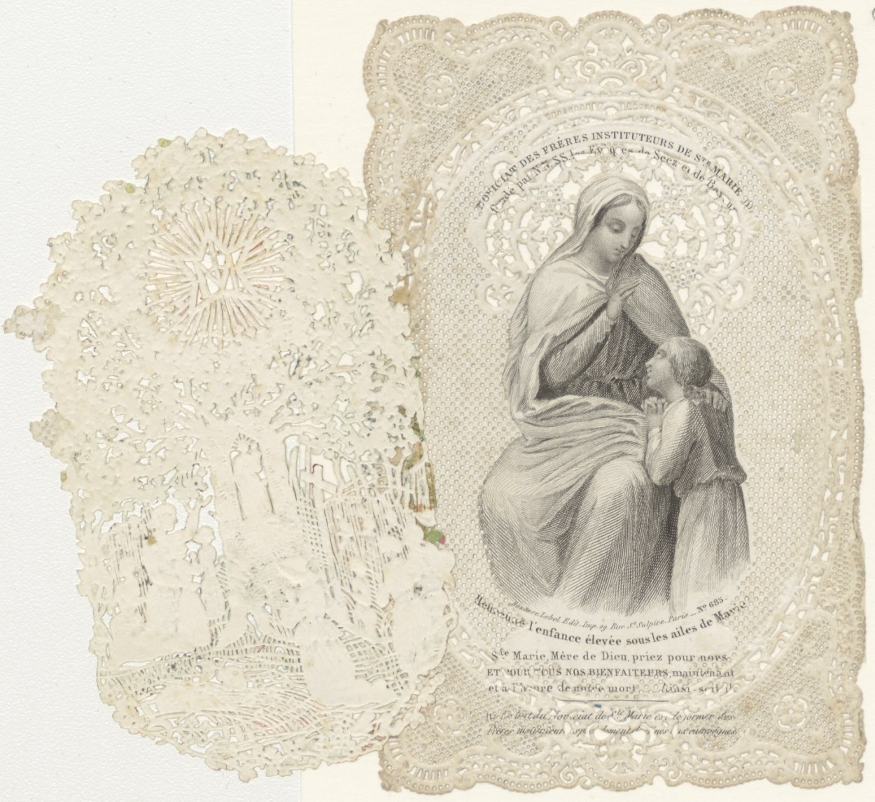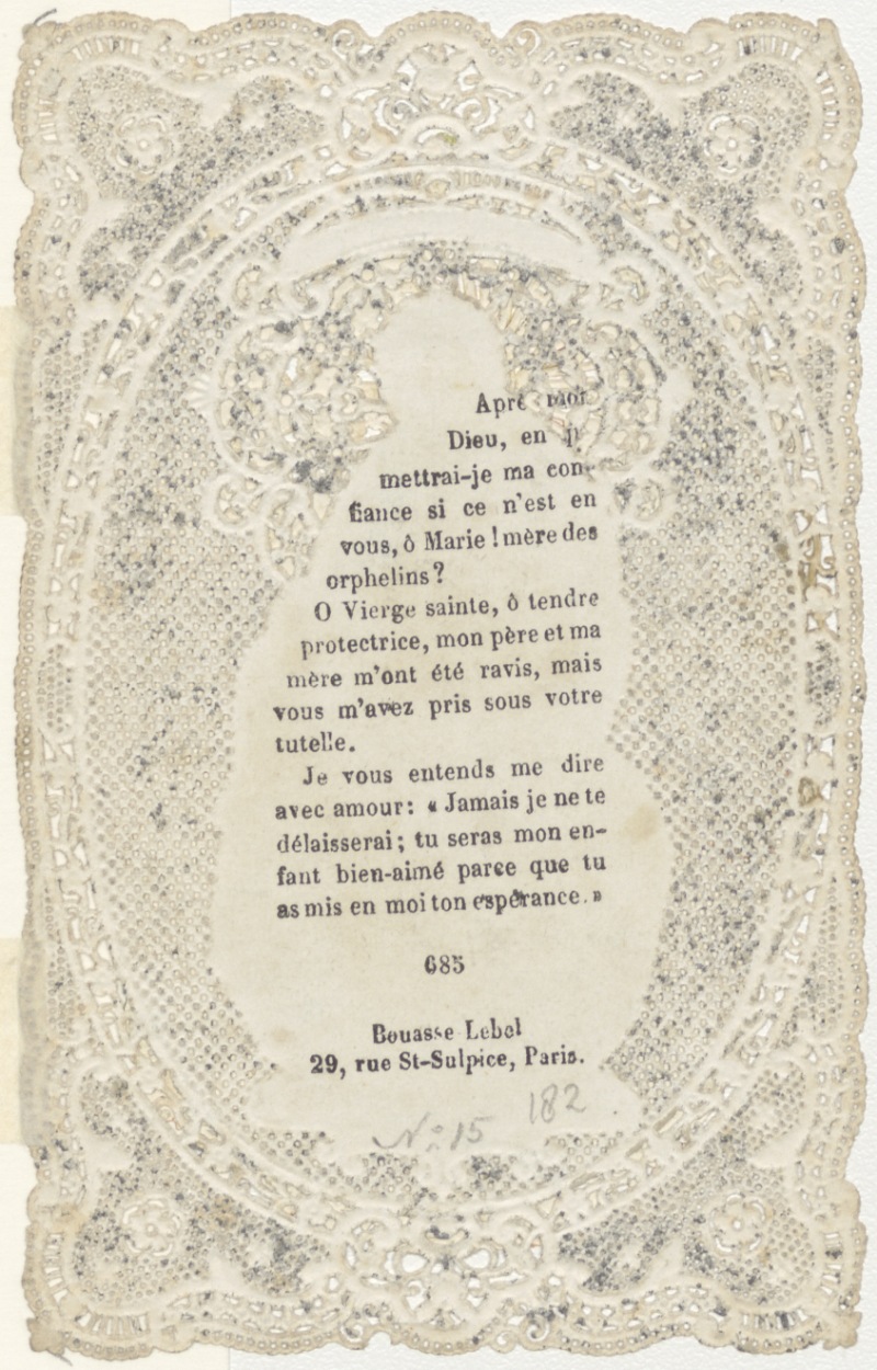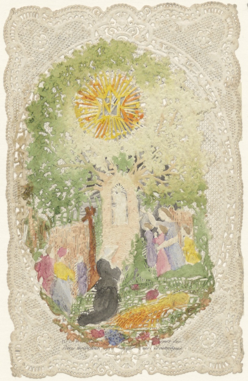 Maria met een kind, Maria beeld in boom aanbeden door mensen, ingekleurd, kz. tekst (Frans)
