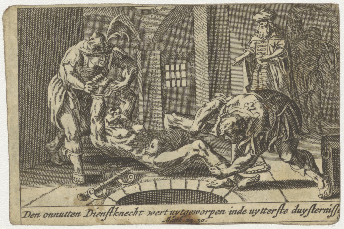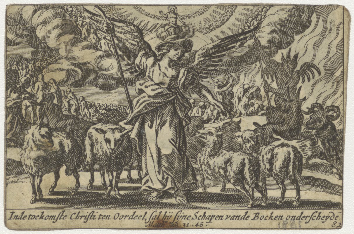 Onnutte dienstknecht wordt uitgeworpen in de duisternist (Math.25:30), kz. Laatste Oordeel; Christus scheidt bokken van schapen
