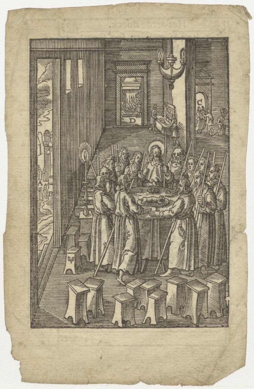 Christus met apostelen tijdens Laatste Avondmaal, kz. boekdruk;tekst
