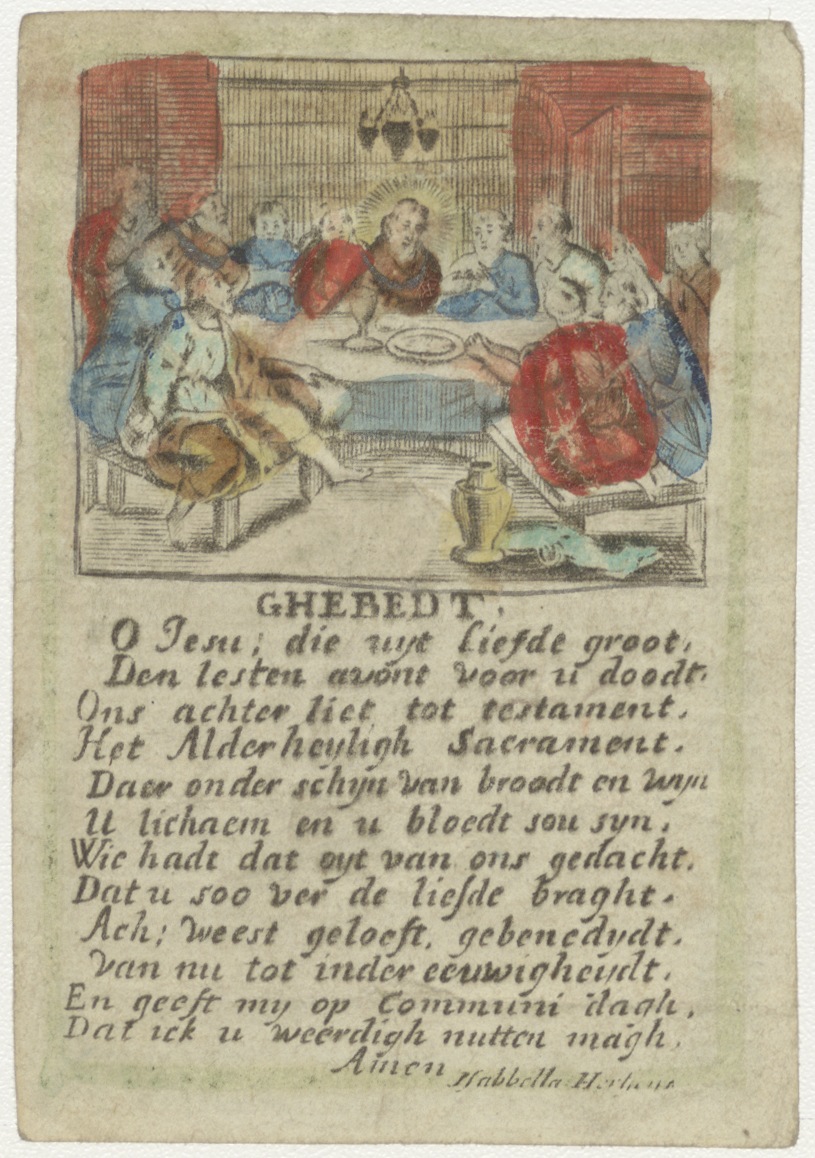 Laatste Avondmaal, ingekleurd, met "Ghebedt O Jesu; die uijt liefde groot Den lesten avont voor u doodt ..."