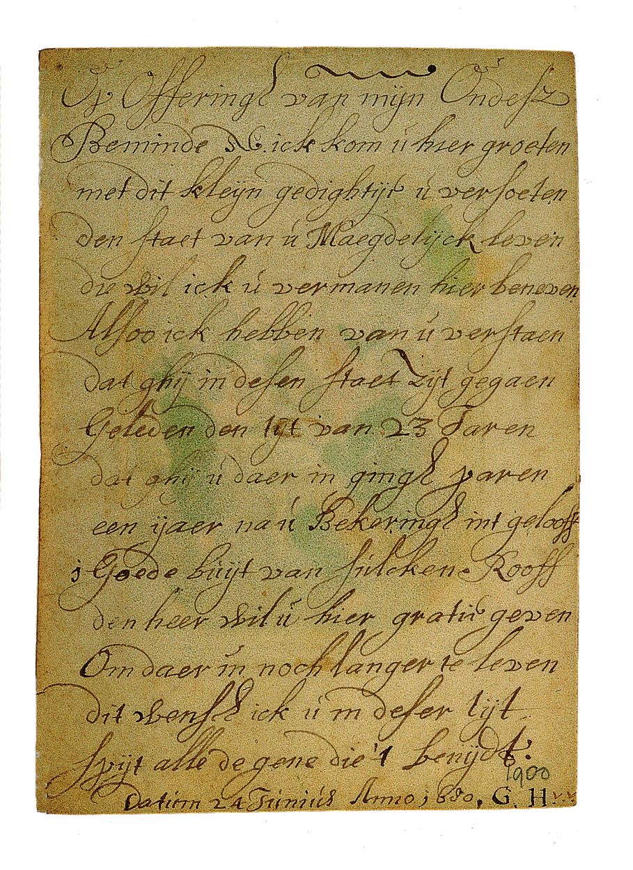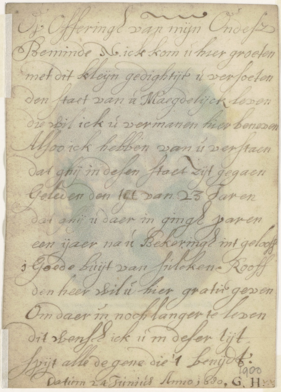 Op keerzijde de tekst: Op Offeringh van mijn Ondesz [?] Beminde S.C. ick kom u hier groeten met dit kleyn gedightijt u versoeten den staet van u Maegdelijck leven die wil ick u vermanen hier beneven Alsoo ick hebben van u verstaen dat ghij in desen staet zijt gegaen Geleden den tyt van 23 Jaren ...