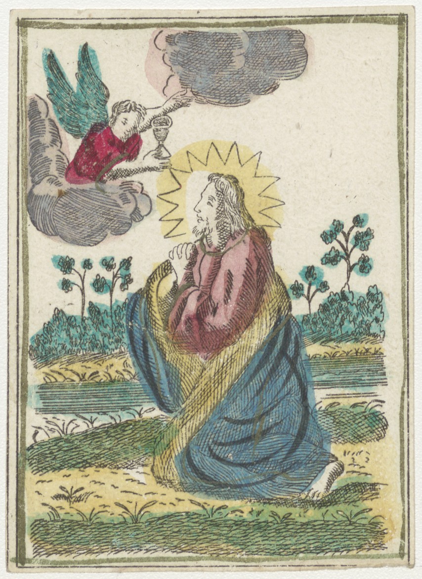 Christus ontvangt het heilig sacrament in de hof van olijven, ingekleurd