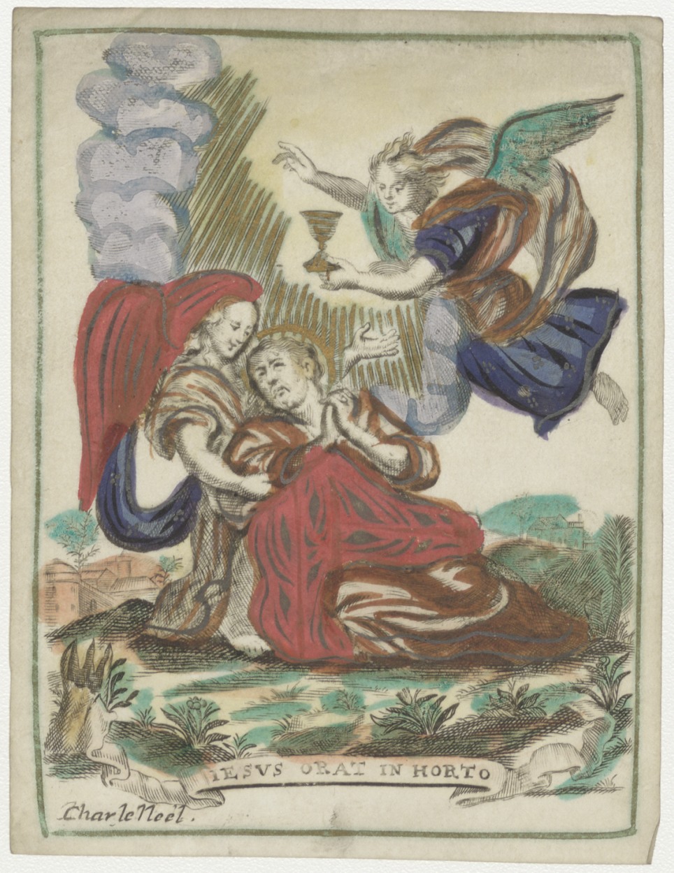 Christus ontvangt het H. Sacrament in de hof van olijven, ingekleurd