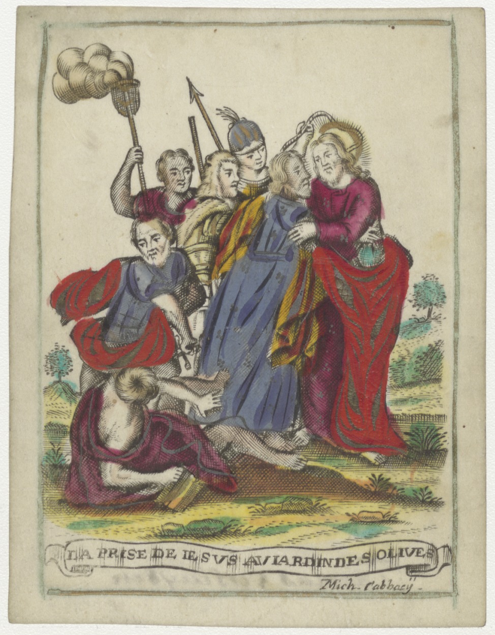 Judaskus, Christus wordt gevangen genomen in de hof van olijven, ingekleurd, kz. Versluysen
