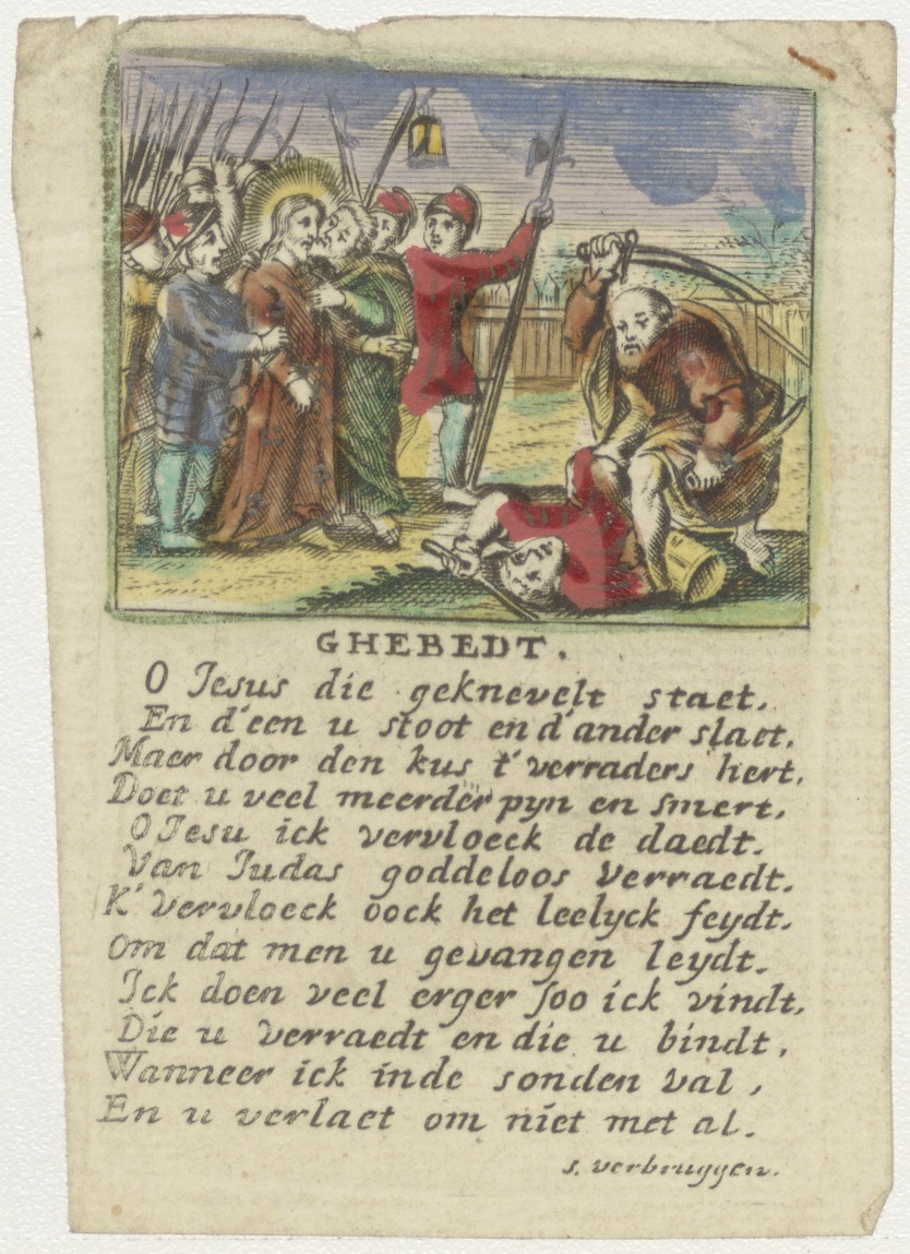 Judaskus, Christus wordt gevangen genomen in de hof van olijven, met gebed, ingekleurd, kz. Versluysen