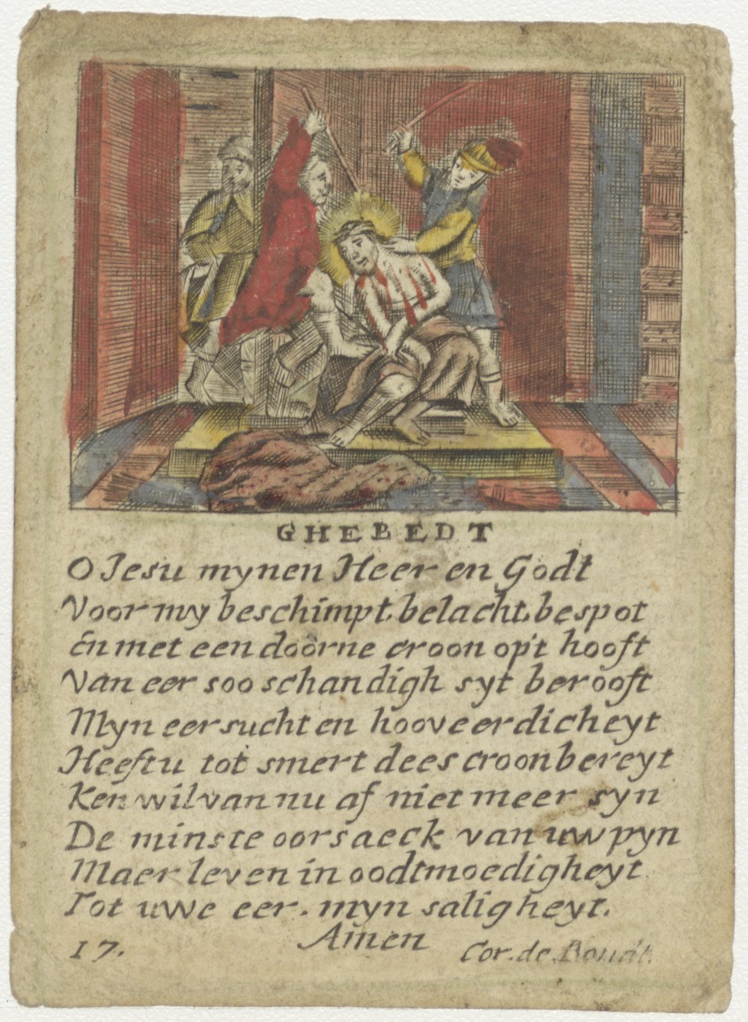 Marteling van Christus, met gebed, ingekleurd, kz. bid voor ziel P.J. van der Hargh (+1825)