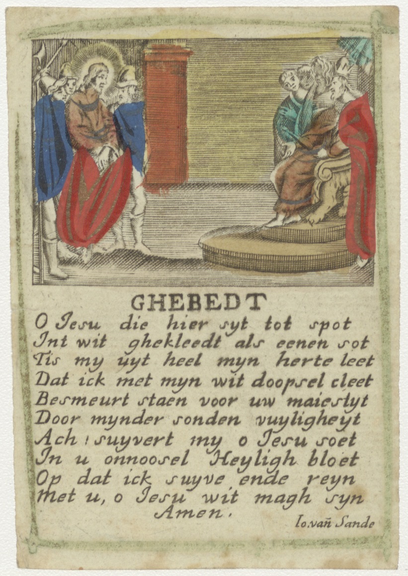 Christus voor Pilatus(?) met gebed, ingekleurd