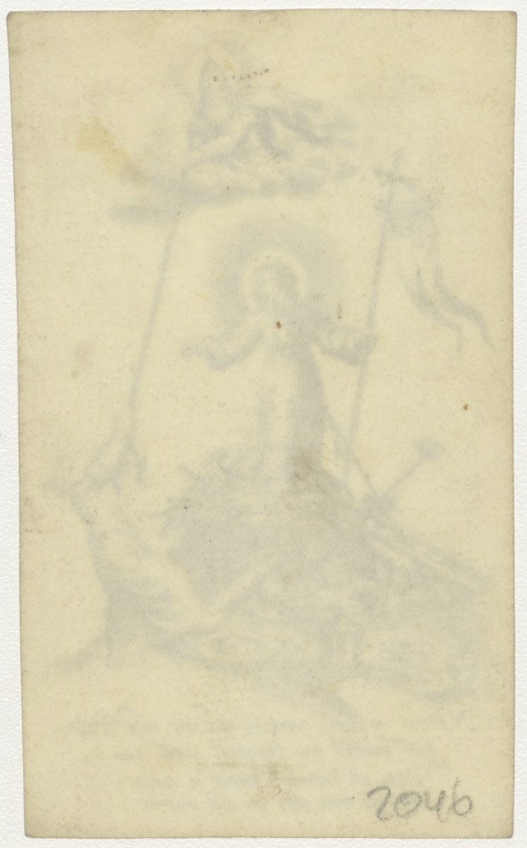 Christuskind met martelwerktuigen vrouw trekt met koord aan God (Latijn)