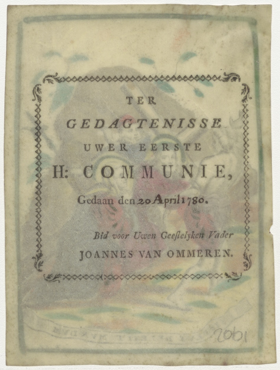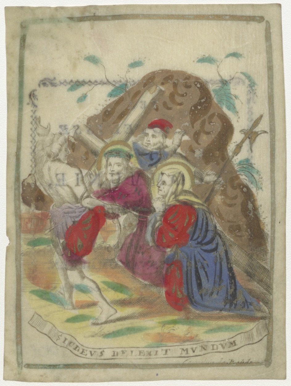 Christus valt onder het kruis, ingekleurd, kz. H. Communie 1780 door pastoor Joannes van Ommeren