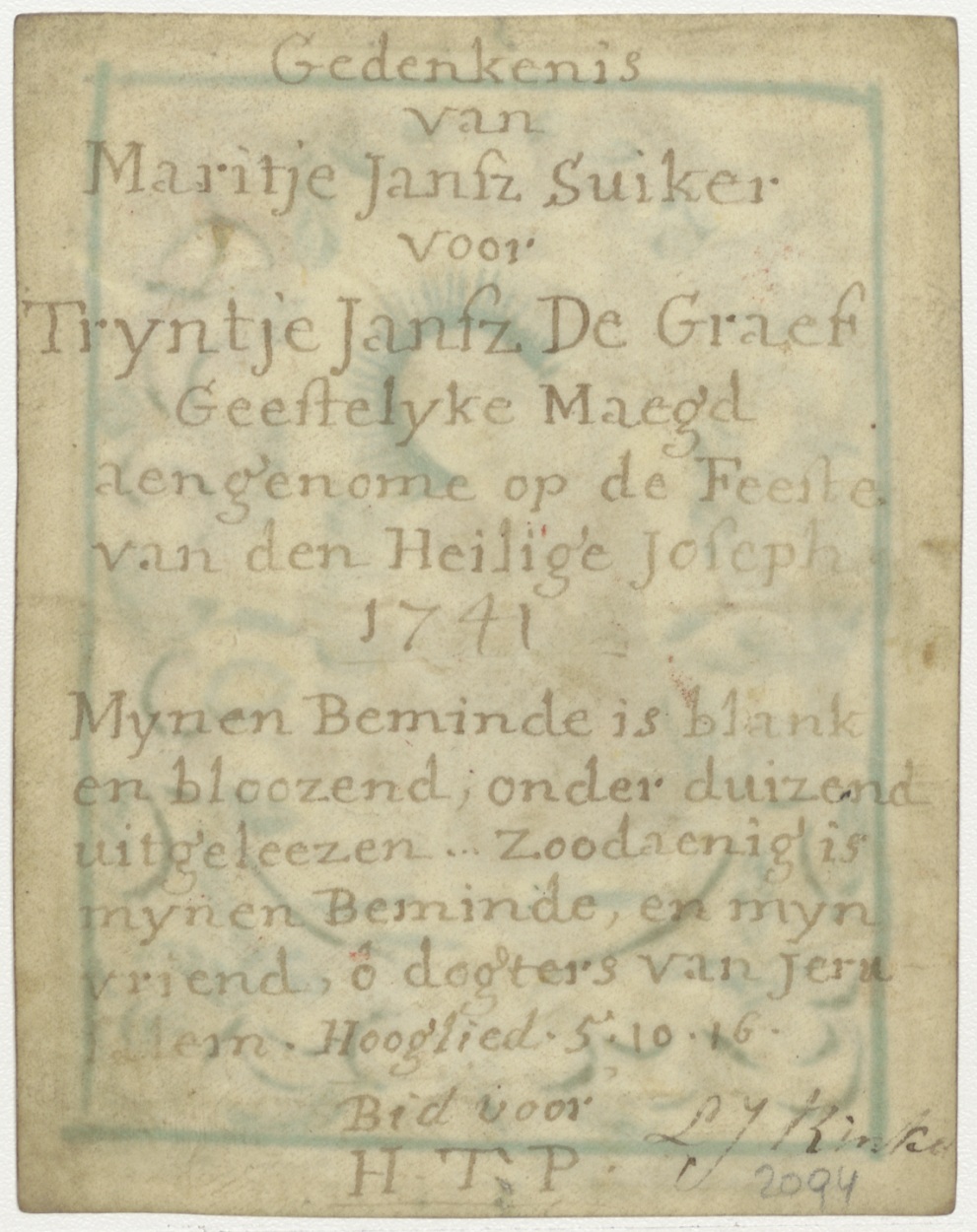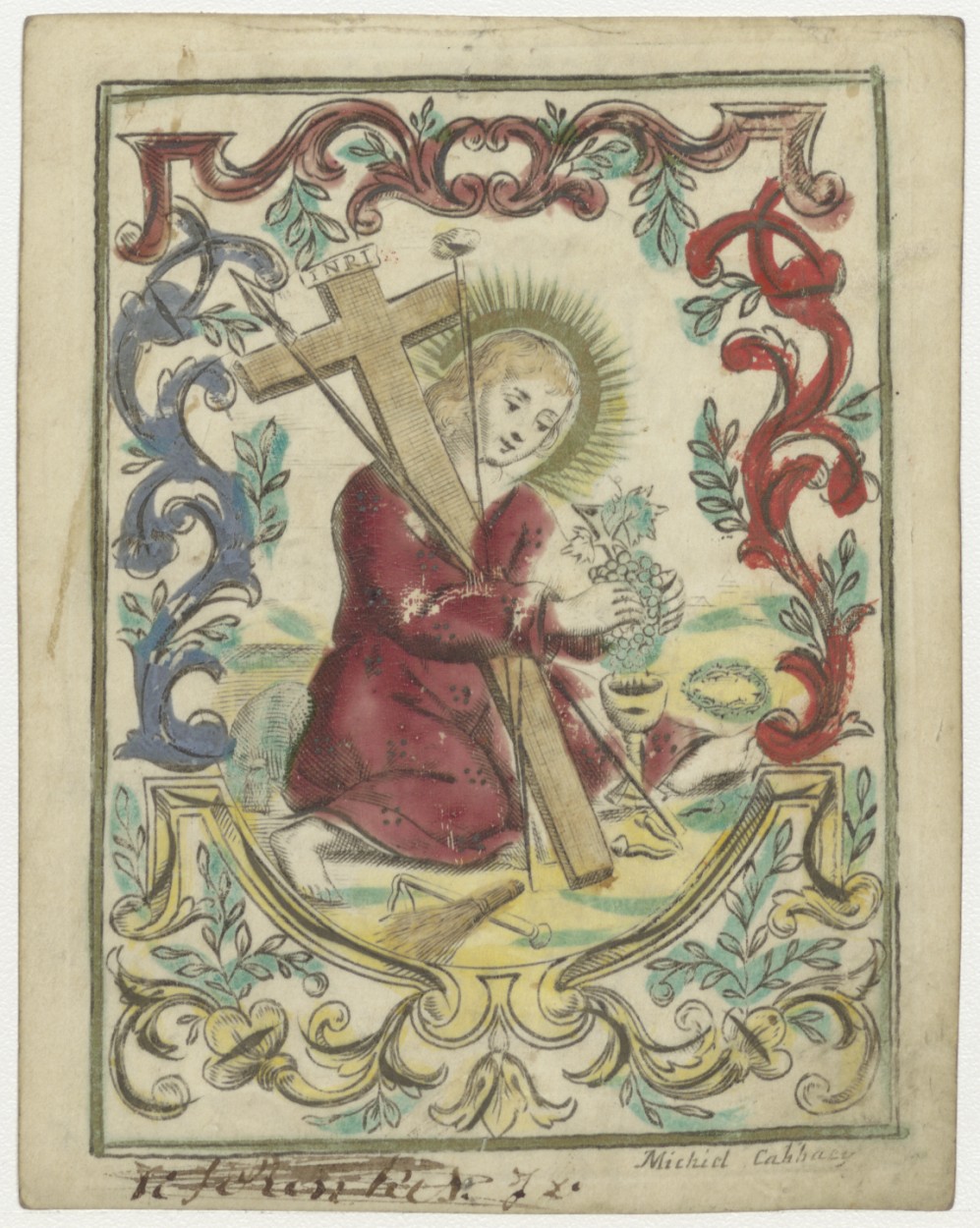 Christus als jongeling met martelwerktuigen, ingekleurd, kz. religieus; van Maritje Jansz Suiker voor Trijntje Jansz de Graef geestelijk maagd, aangenomen 1741, bid voor H.T.P.