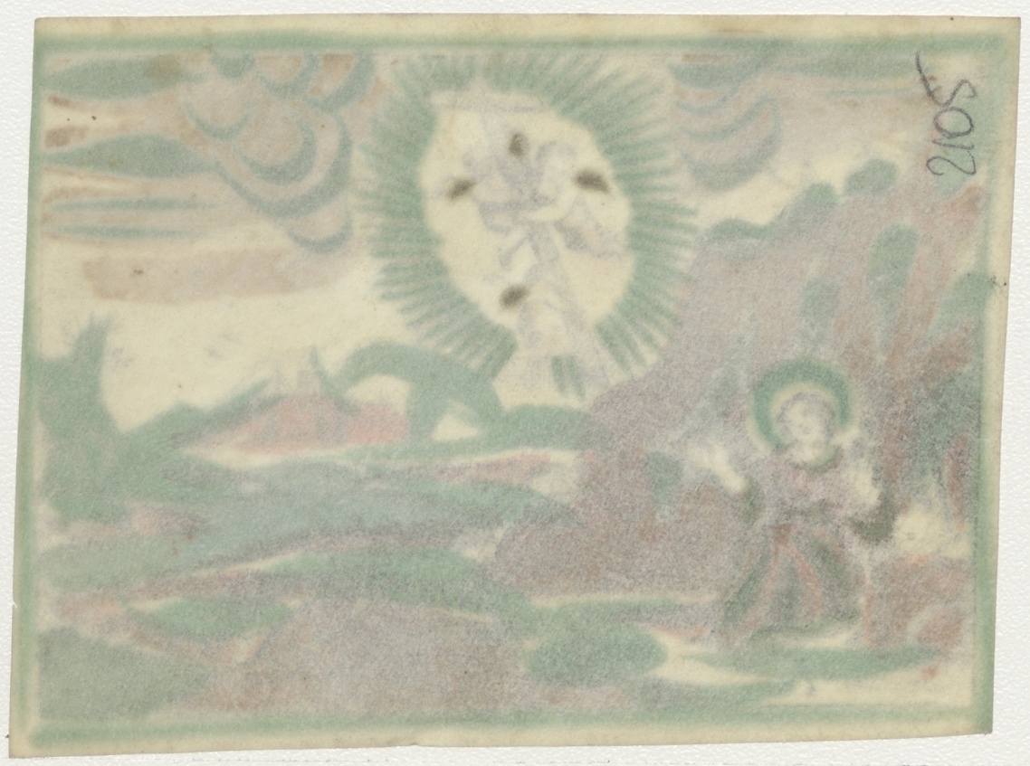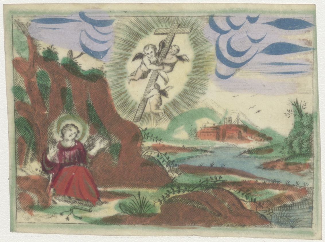 Maria Magdalena ziet kruis uit de hemel gedragen door engelen, ingekleurd