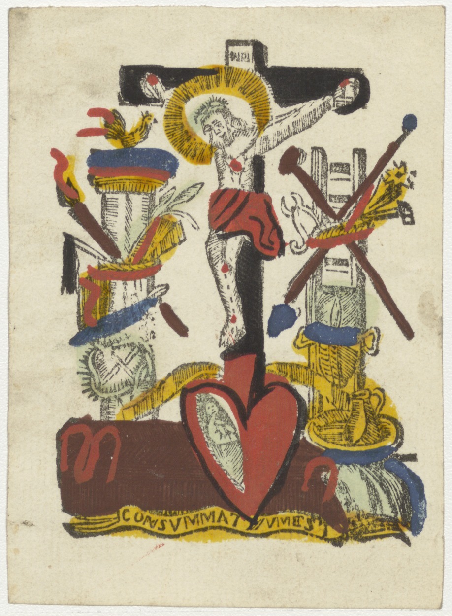 Gekruisigde Christus met martelwerktuigen, ingekleurd