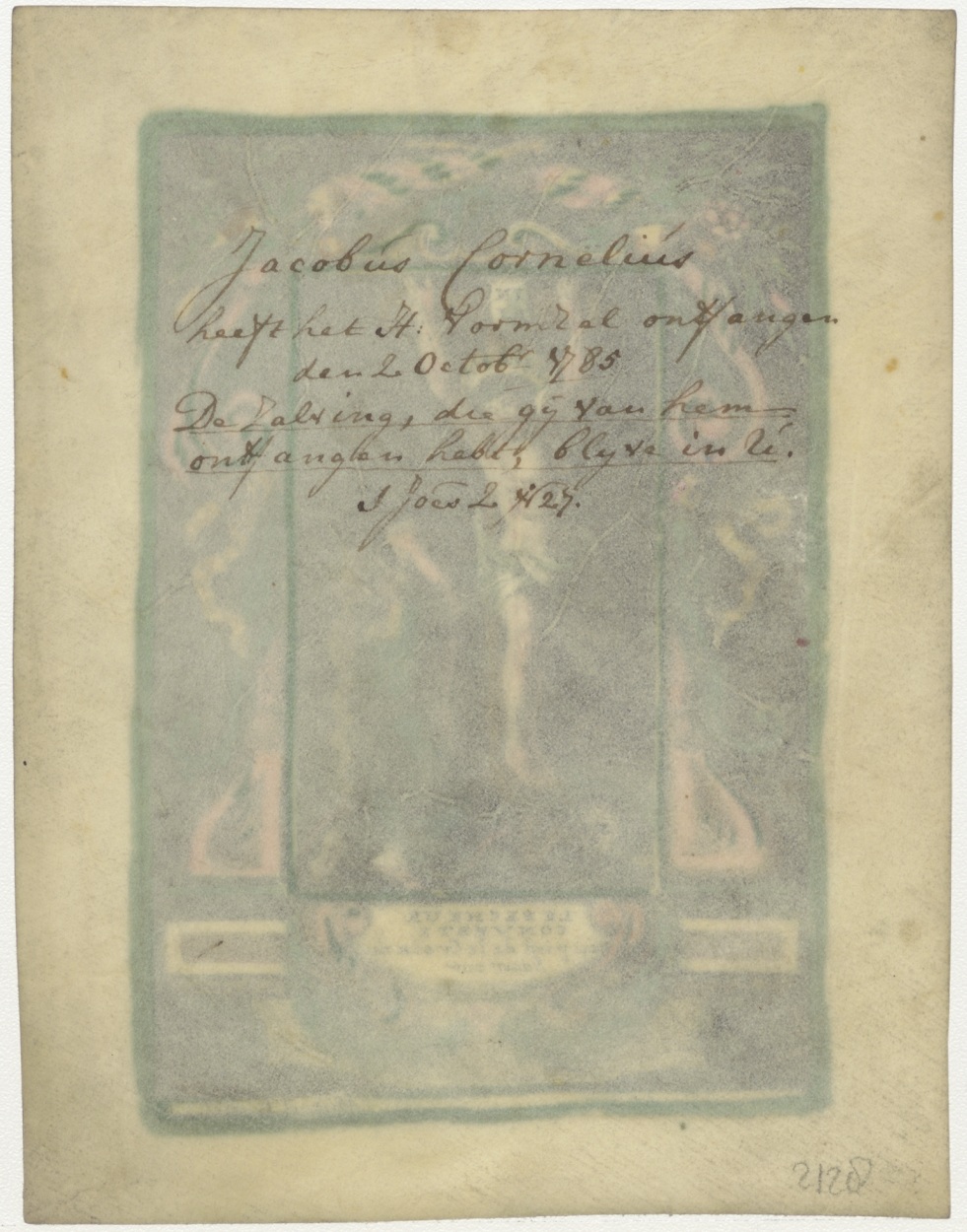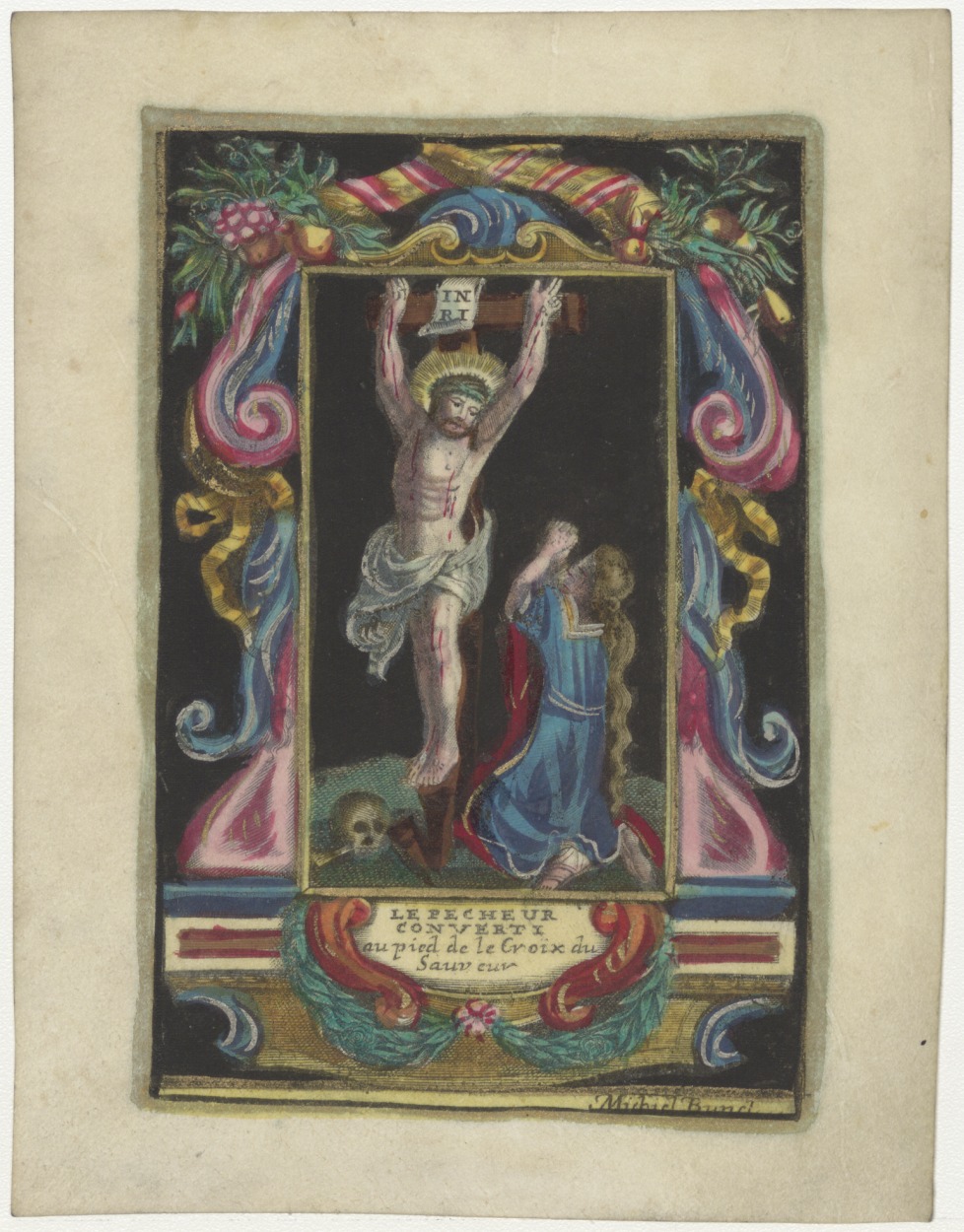 Gekruisigde Christus met Maria Magdalena, ingekleurd, kz. H. Vormsel Jacobus Cornelius (1785)